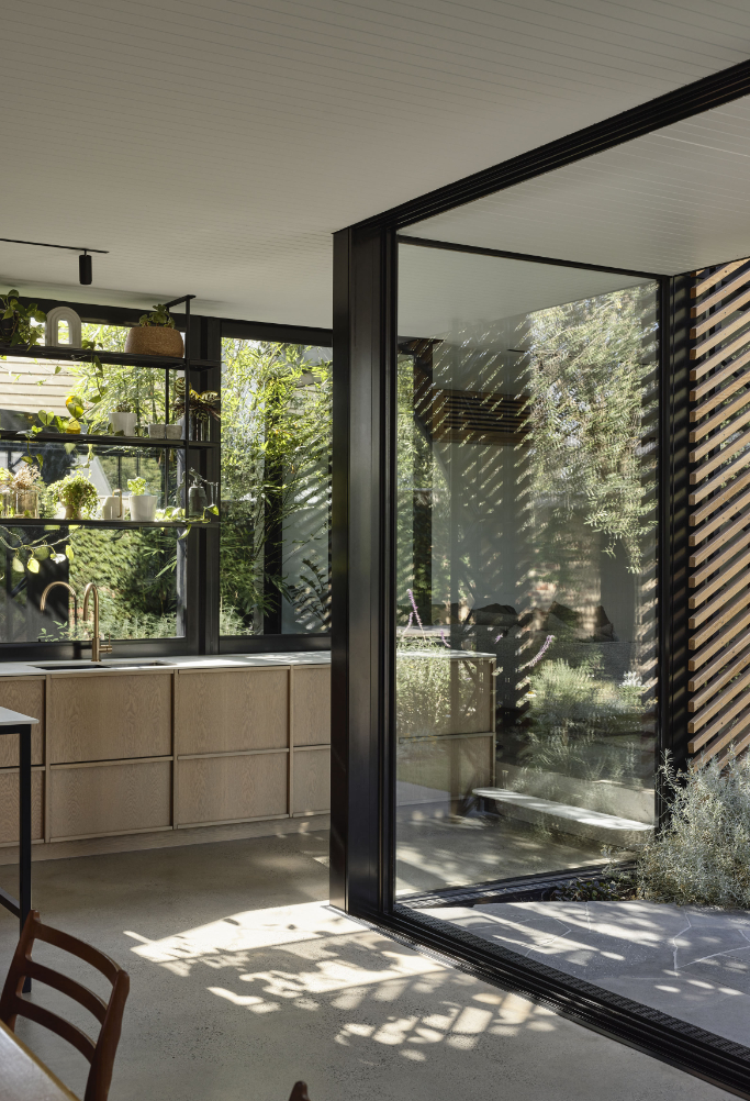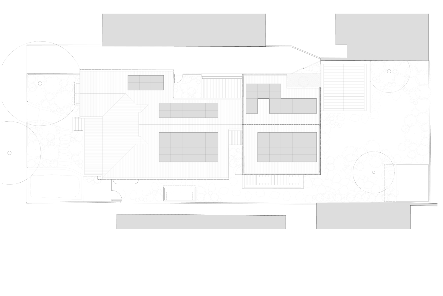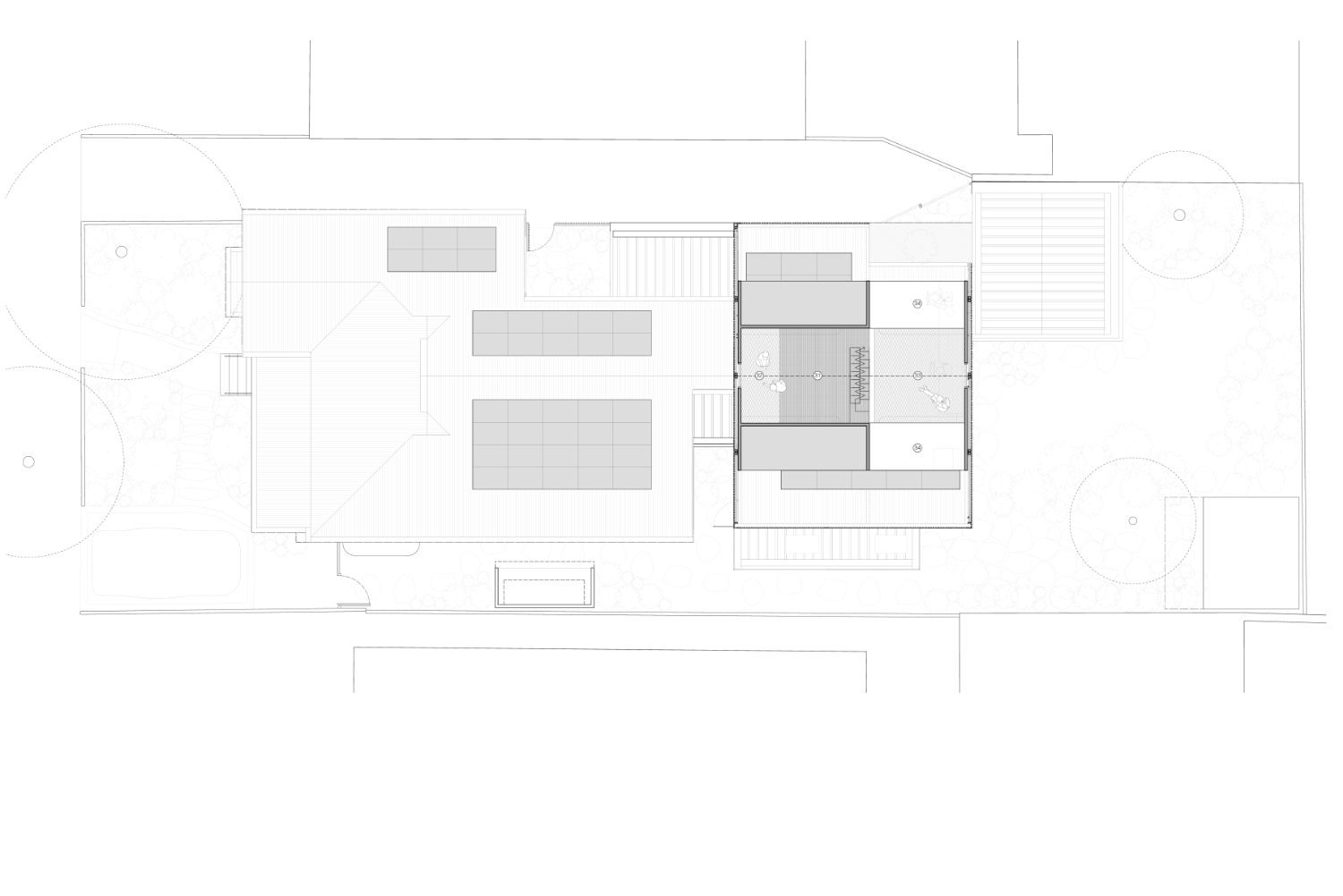 V průběhu naplňování všech požadavků a jejich přetavování do reálné hmoty získala přístavba nezvyklý stupňovitý tvar. Aby došlo ke sjednocení všech hmot, byla přes novou část instalována lamelová stěna, která z domu vytváří jednoduchý celek a zároveň poskytuje stínění, vytváří krytou verandu a zamezuje pohledům zvenčí. Úhel naklonění lamel vychází ze sklonu střechy původního domu. Technické zázemí a úložné prostory pro kola a odpadové hospodářství jsou integrovány po obou stranách přístavby a skryty za posuvnými dveřmi z lamel. Lamelové stěny i celoprosklenou stěnu obývacího prostoru lze z rohu zcela otevřít, a dům tak propojit se zahradou.
