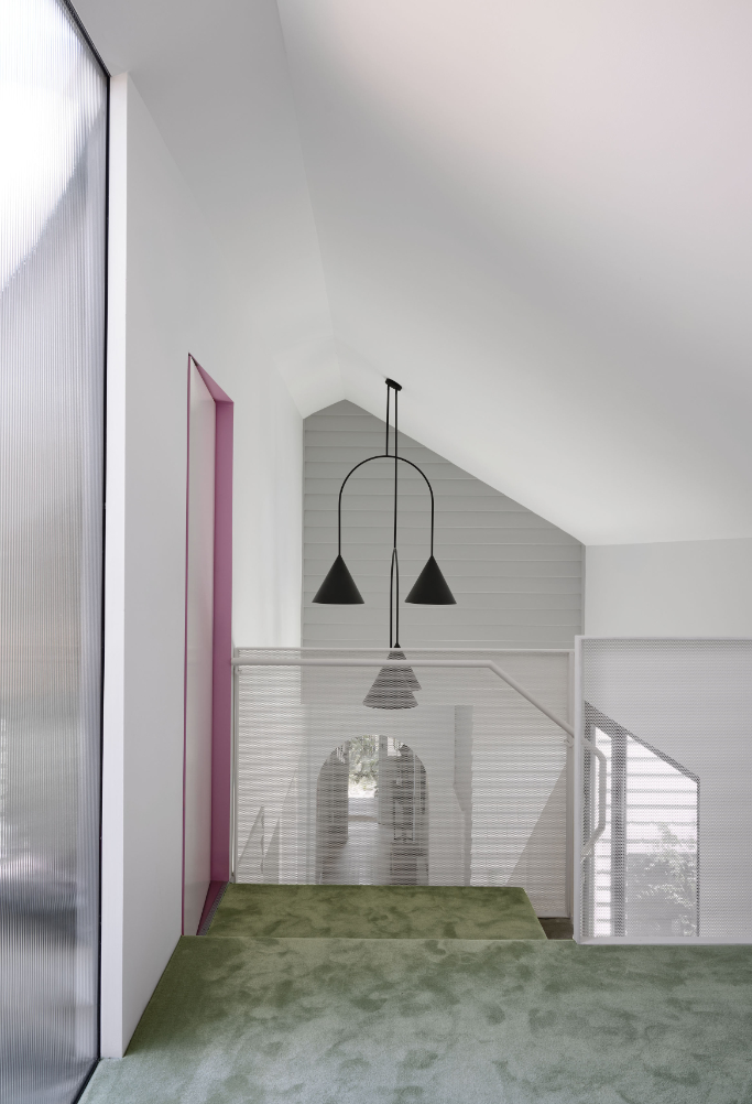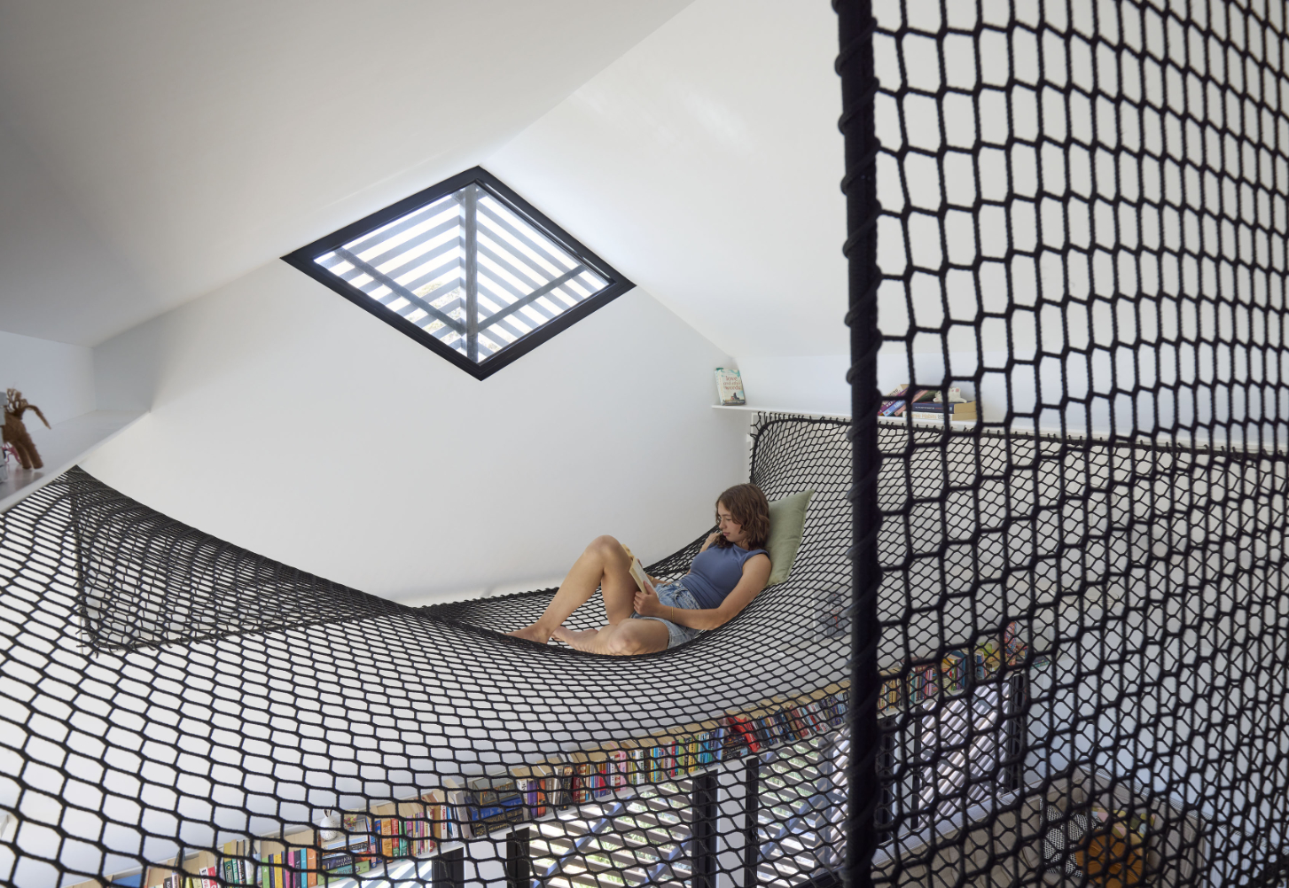 Původní objekt vyžadoval celkovou rekonstrukci – podřezání základů, nové omítky, podlahy, topení i elektroinstalaci. Nová přístavba v přízemí nabízí samostatnou prádelnu a spíž, prostornou kuchyni s jídelnou a obývací pokoj, který je mírně vyvýšený a vysunutý do zahrady. Nový vstup z boční fasády vede do patra, kde se nacházejí dvě ložnice, koupelna, tajná růžová kreativní dílna a pracovna s televizním koutem a relaxační zónou s prostornou houpací sítí zavěšenou pod vysokým stropem.