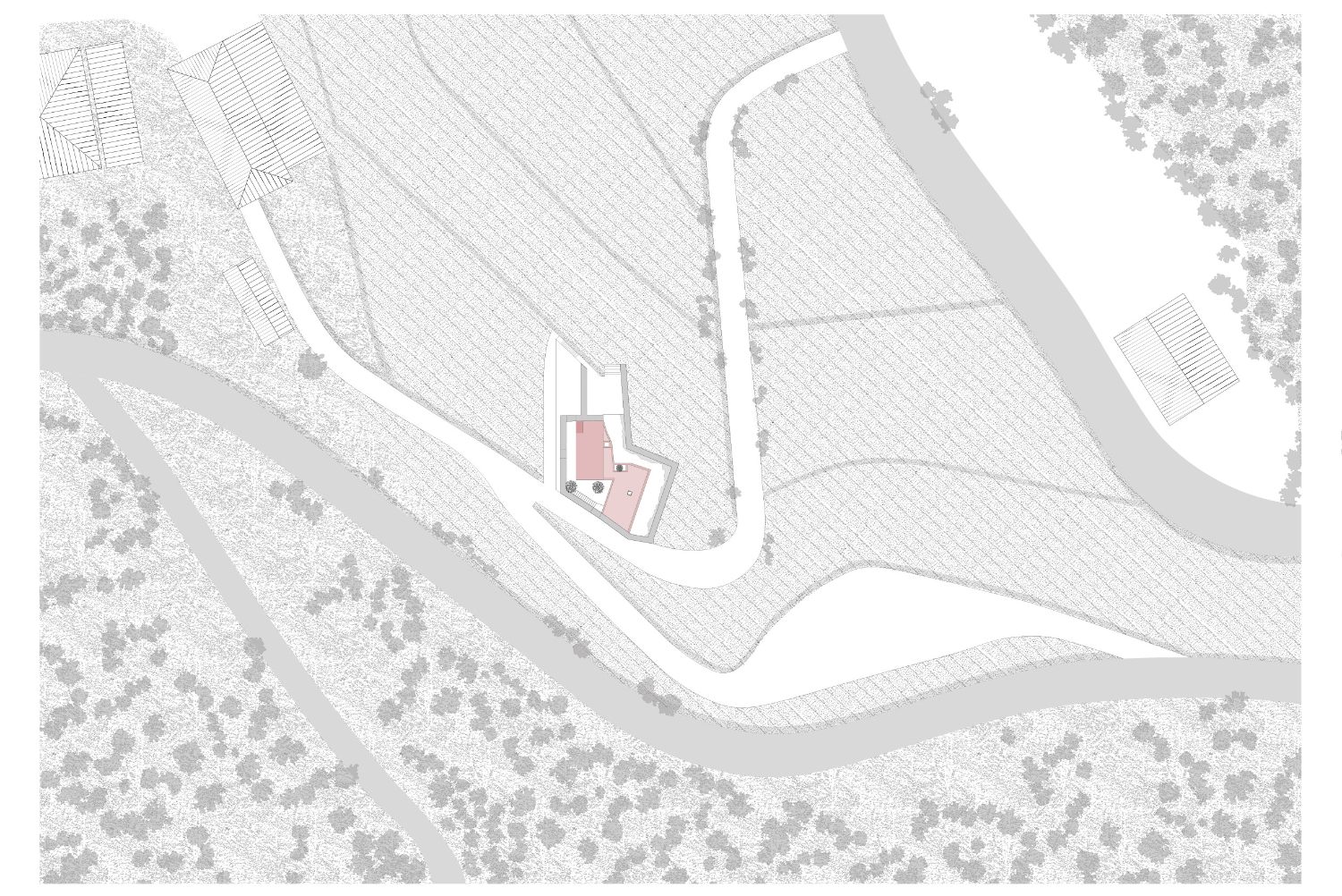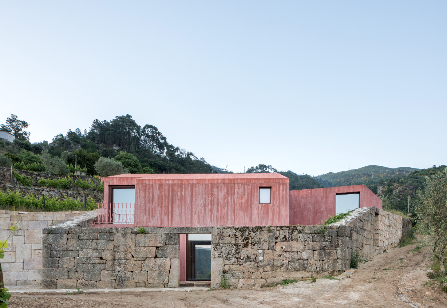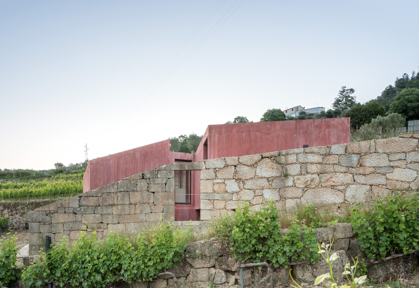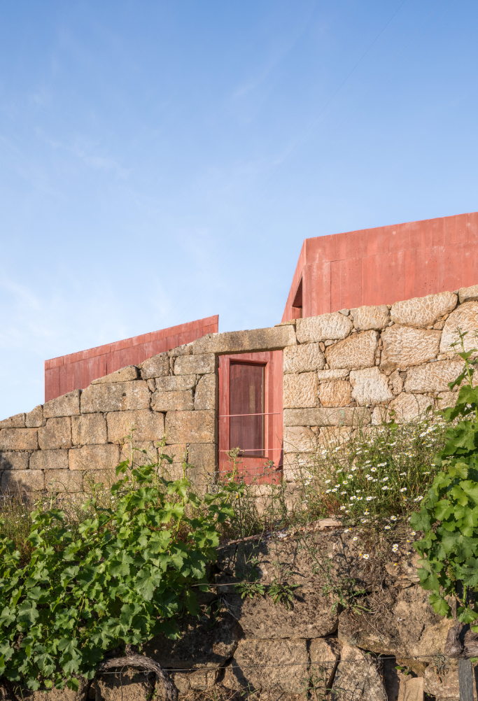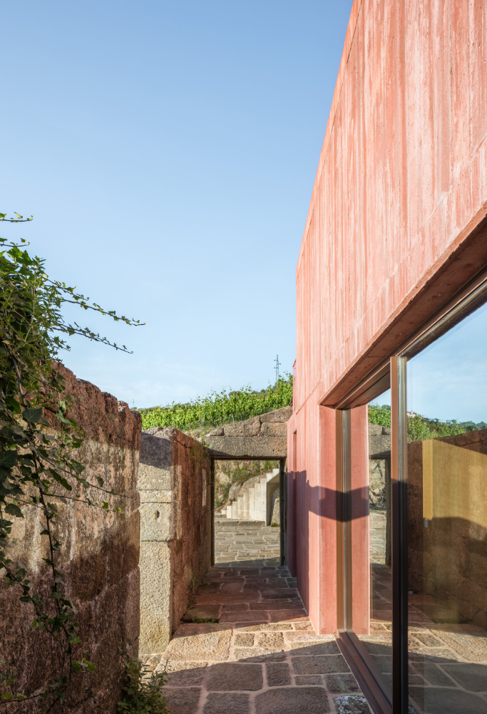 Původní myšlenkou architektů bylo dům zcela zapustit do svahu. Poté, co průzkumy objevily pod celým pozemkem žulovou skálu, vznikly dvě hmoty nad terénem přirozeně kopírující hranice pozemku. Růžově pigmentovaný beton budovu vůči okolí jasně vymezuje. Použití této konkrétní barvy vychází z chromatické tradice mnoha okolních staveb a zeleň vinic přirozeně doplňuje.