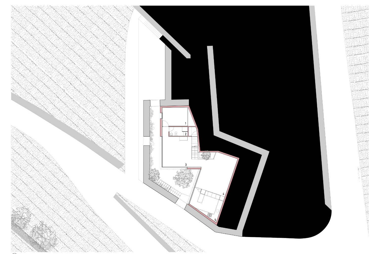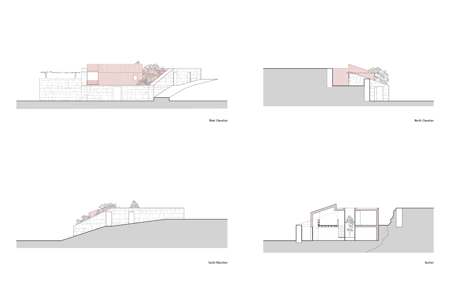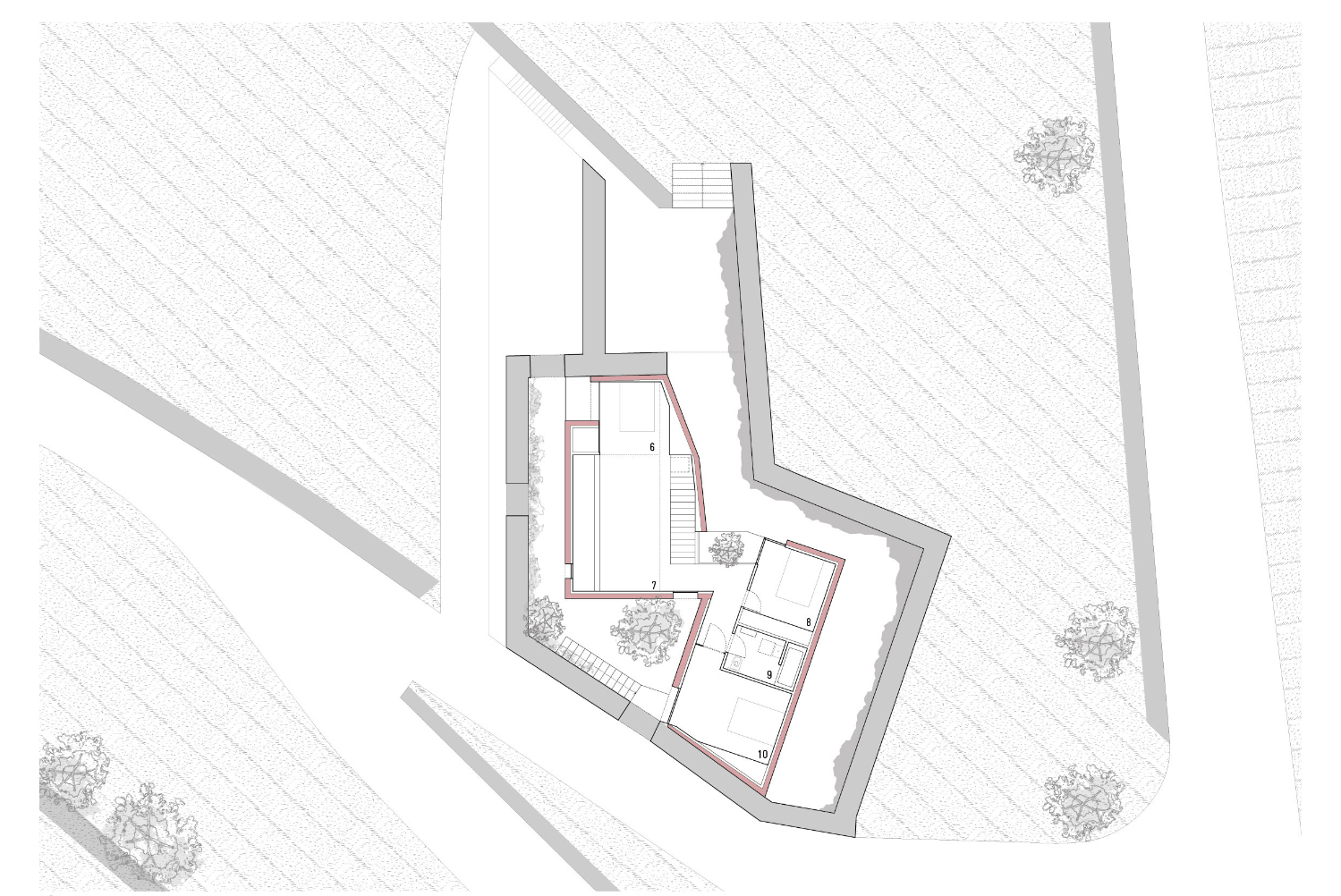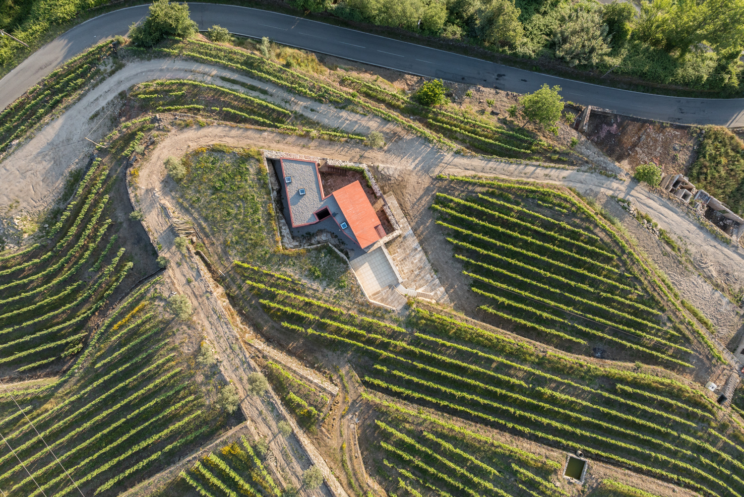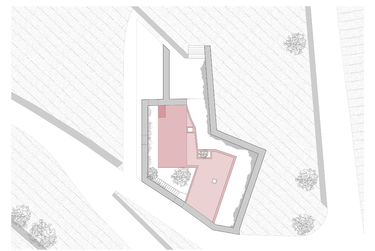 Původní myšlenkou architektů bylo dům zcela zapustit do svahu. Poté, co průzkumy objevily pod celým pozemkem žulovou skálu, vznikly dvě hmoty nad terénem přirozeně kopírující hranice pozemku. Růžově pigmentovaný beton budovu vůči okolí jasně vymezuje. Použití této konkrétní barvy vychází z chromatické tradice mnoha okolních staveb a zeleň vinic přirozeně doplňuje.
