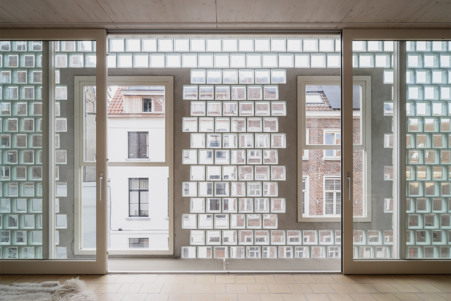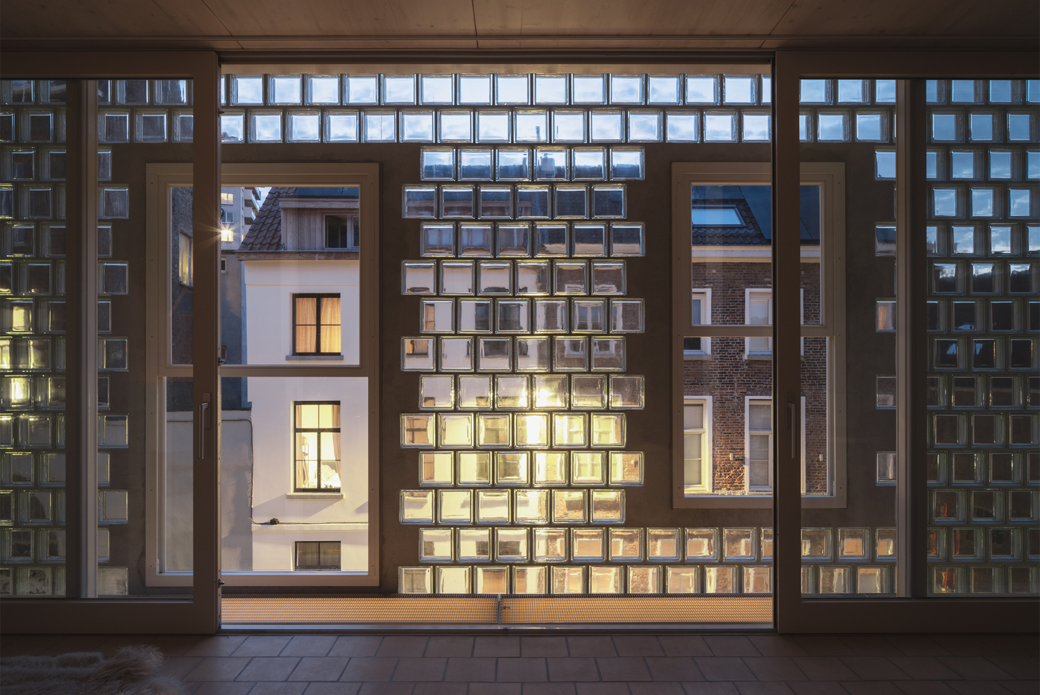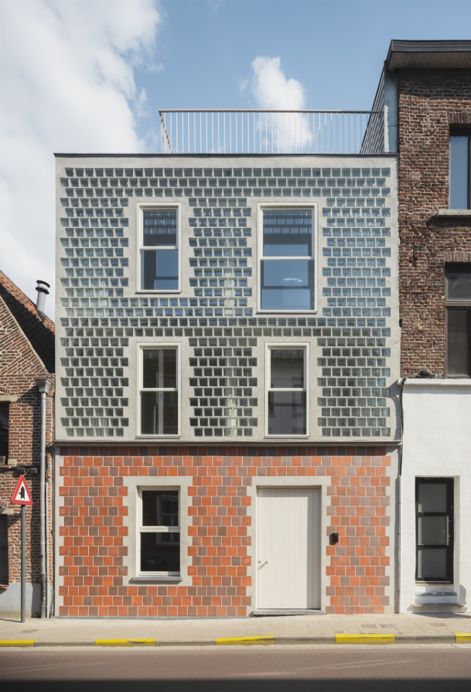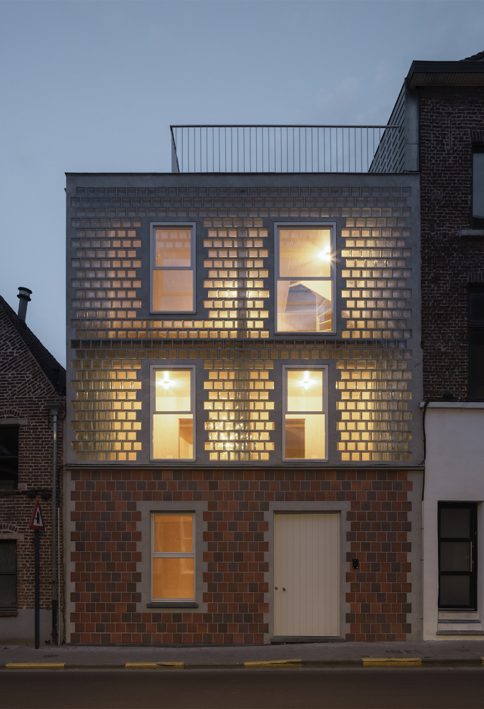 The house opens upward: the lower floors are bedrooms, while the upper floors are living spaces. A rooftop terrace crowns the building. This ‘inverted’ layout is expressed in the façade: closed off at the bottom with terracotta tiles, and open at the top with glass tiles. Thanks to the accessible double façade, the compact house receives maximum daylight without sacrificing privacy, while also being highly efficient.