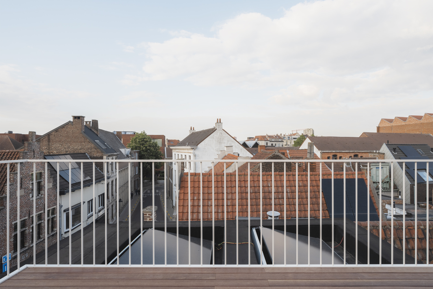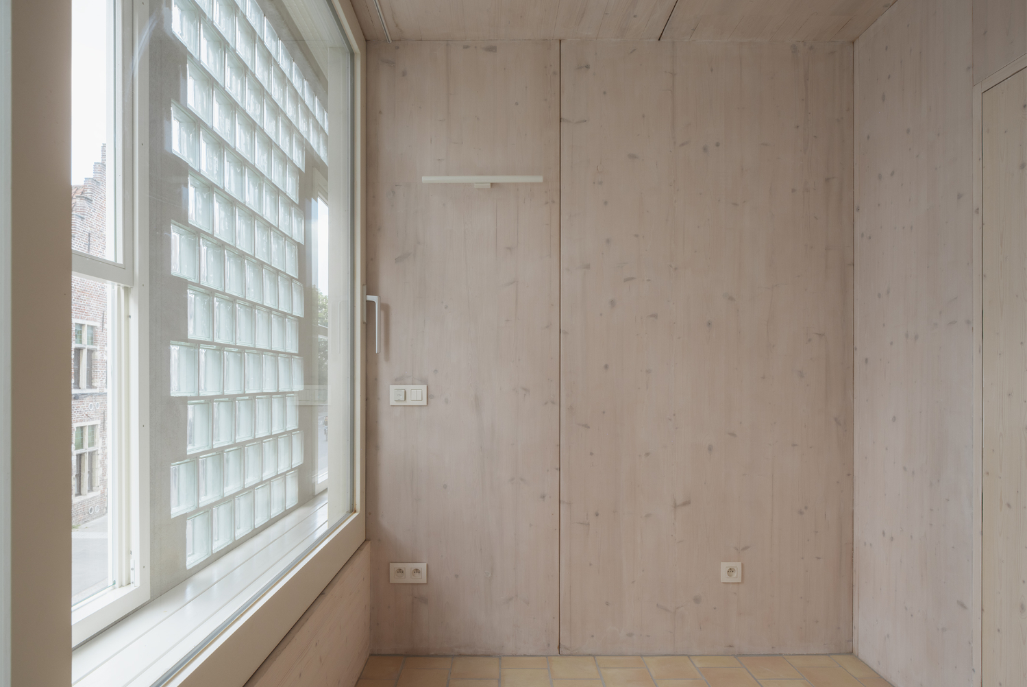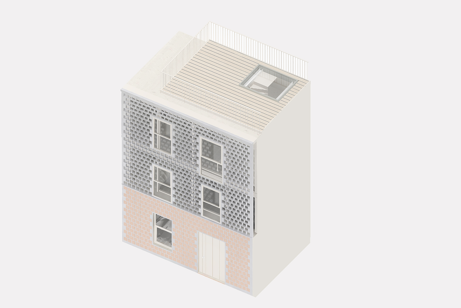 The house opens upward: the lower floors are bedrooms, while the upper floors are living spaces. A rooftop terrace crowns the building. This ‘inverted’ layout is expressed in the façade: closed off at the bottom with terracotta tiles, and open at the top with glass tiles. Thanks to the accessible double façade, the compact house receives maximum daylight without sacrificing privacy, while also being highly efficient.