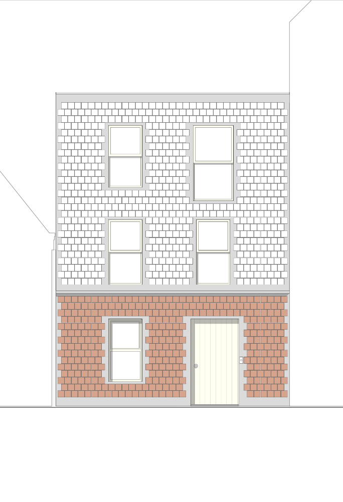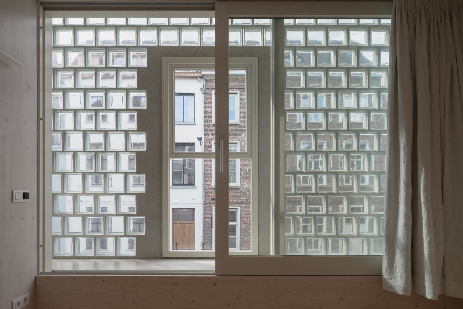 The bold glass-tile front façade is surprisingly harmonious. It speaks the language of a typical terraced house. The brickwork pattern and ornamented frames around the windows reference the stepped-gable house from 1707 just down the street.