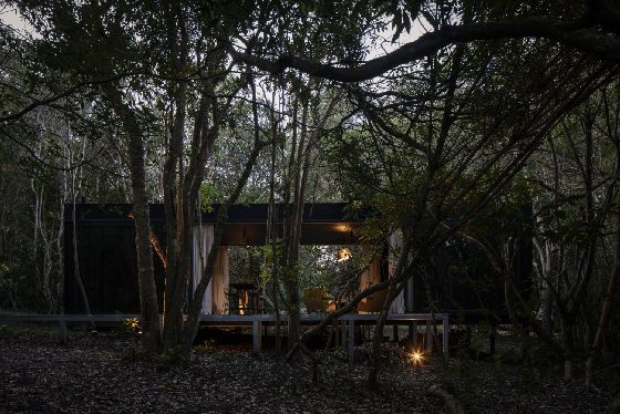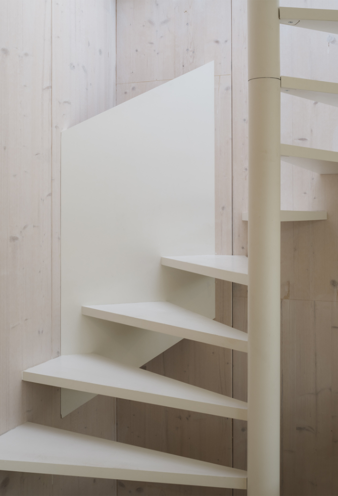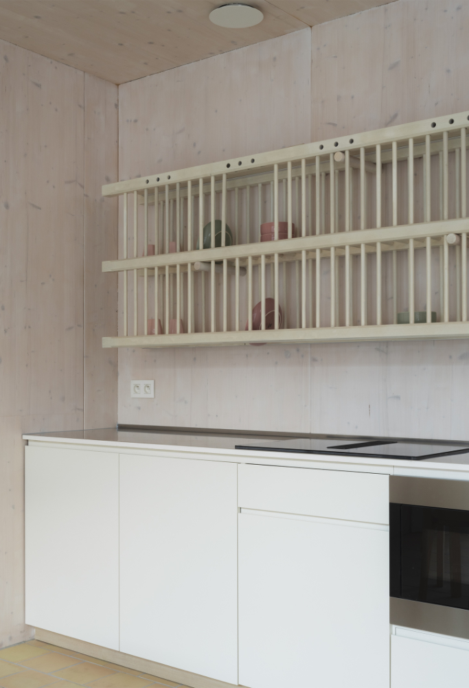 The interior radiates simplicity and restraint by exclusively using honest and sustainable materials: exposed white-stained solid wood walls and natural terracotta flooring.