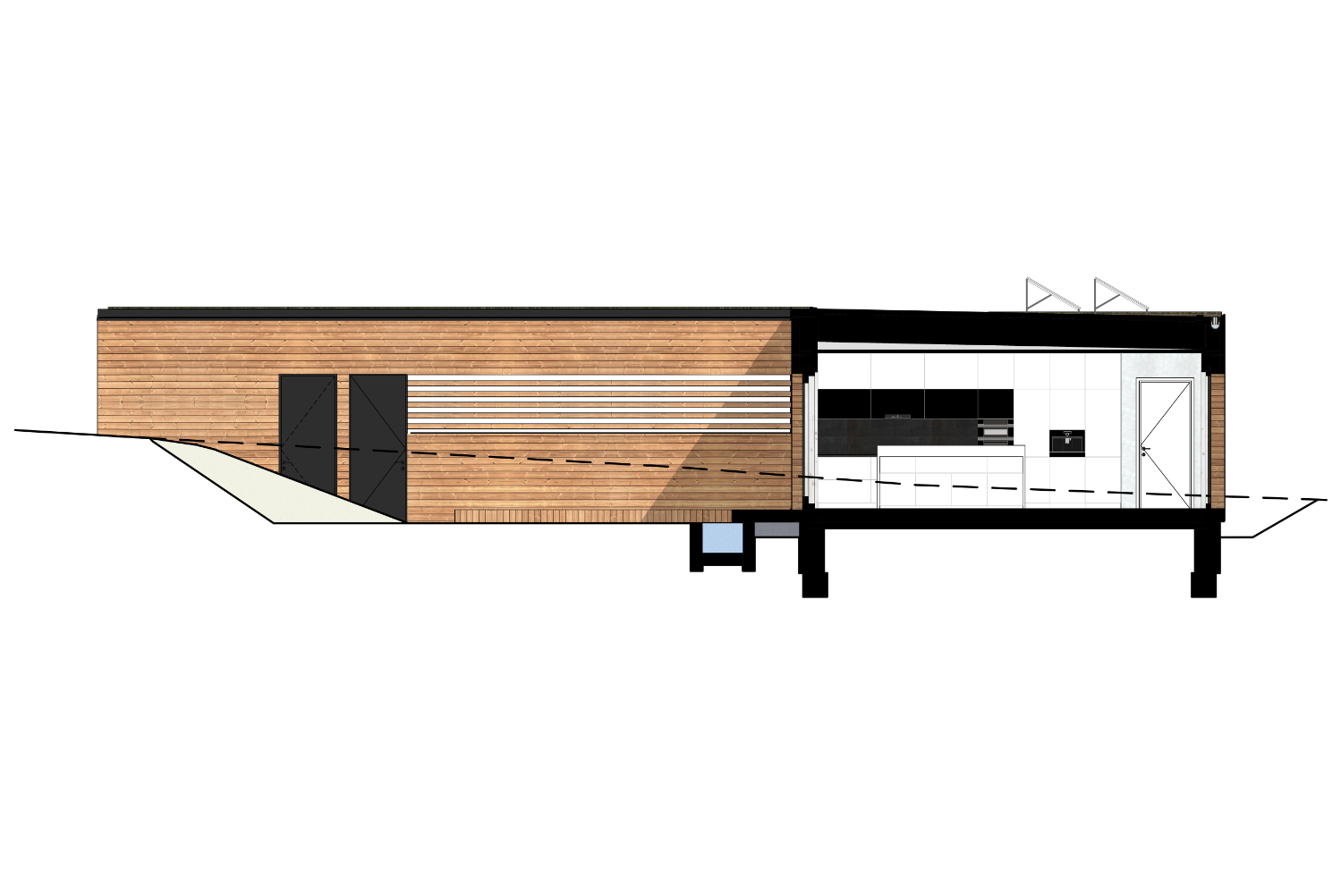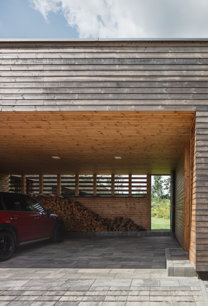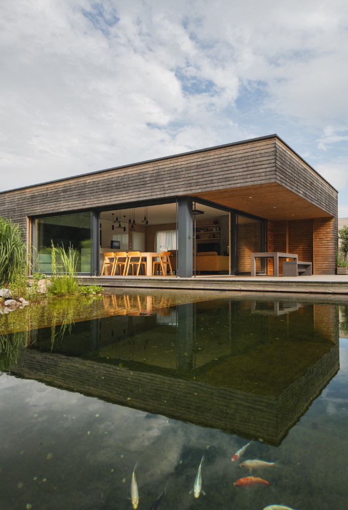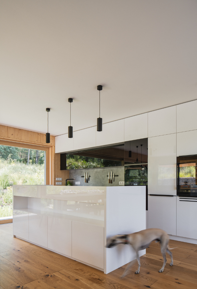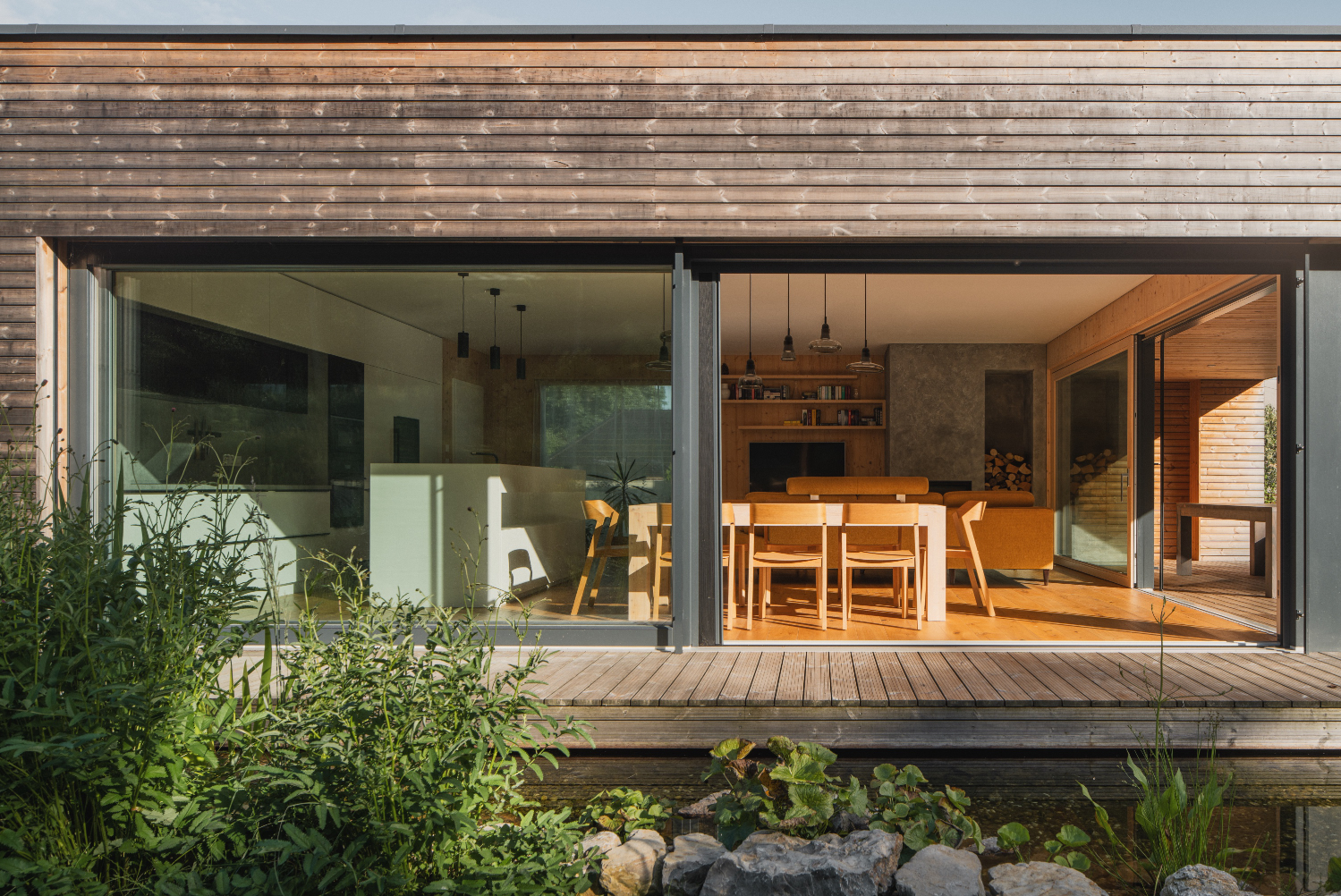The structural design uses large-format solid wood panels (Novatop Solid), which ensure high rigidity, excellent insulation, and a pleasant indoor climate. The façade is made of thermally treated Thermowood, which naturally ages and blends with the surrounding greenery. A green mono-pitched roof helps integrate the house into the landscape and contributes to its thermal stability.