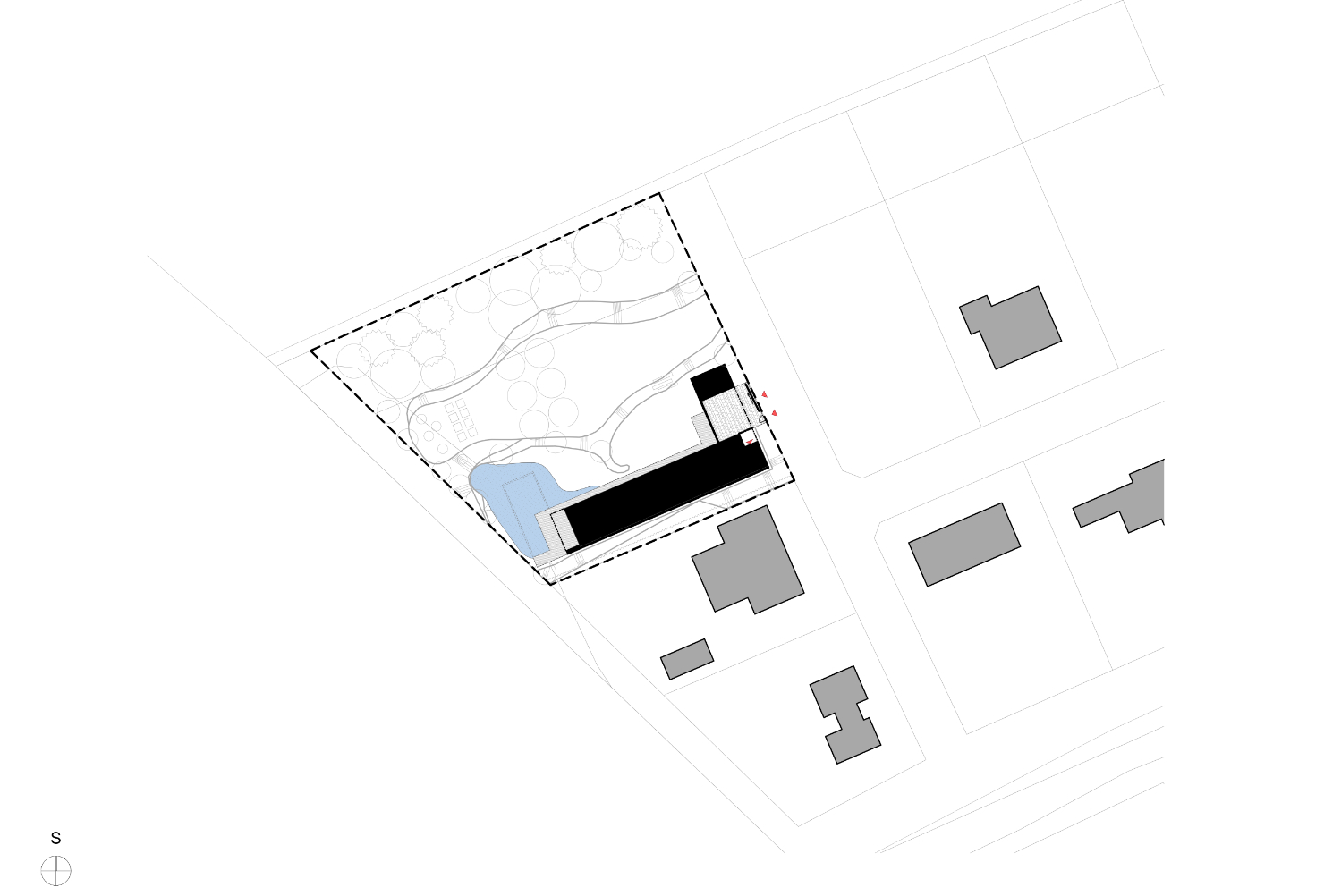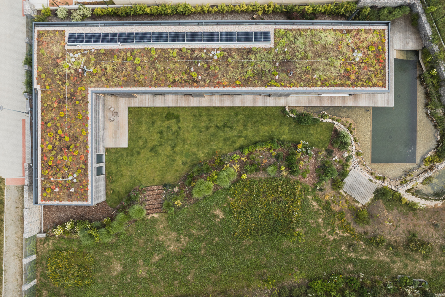 The building has an L-shaped layout and uses the gentle slope of the land to its advantage. From the street, it appears modest and closed, respecting its surroundings while offering maximum privacy. Inside, however, it opens up to an intimate garden—a carefully sculpted space that gently ascends toward the forest and blends into open nature. The terraced terrain adds a natural dynamic, making the garden an extension of the living area.