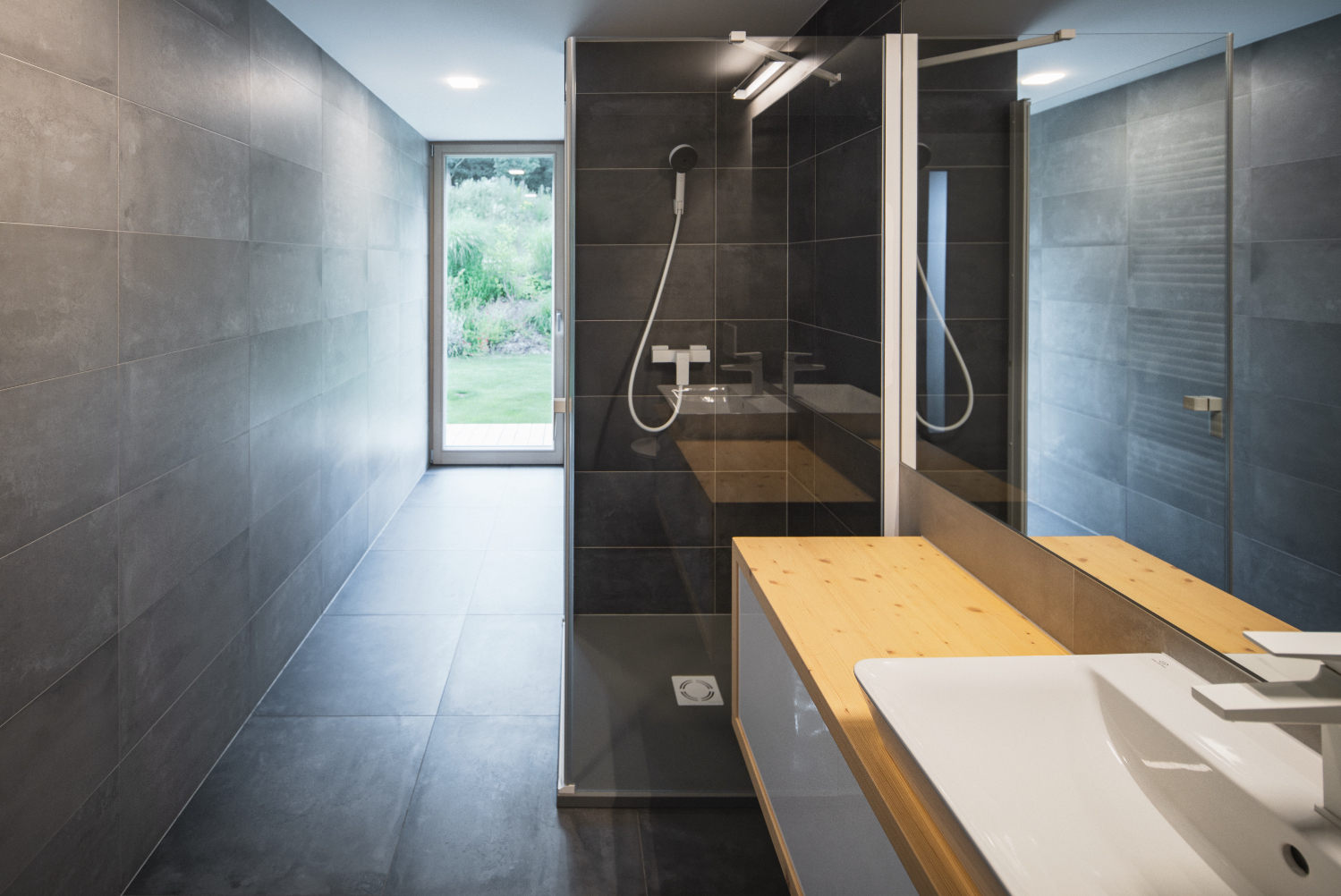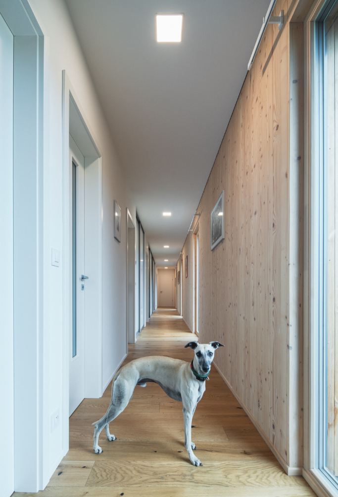 The house was designed with a focus on efficient operation and sustainability. Heating is provided by electric underfloor heating supplemented by a fireplace insert, and water is heated by a heat pump. The energy balance is supported by a photovoltaic system on the roof and a rainwater storage tank. Recycled materials and vapor-open assemblies were used in the construction, and humidity sensors were installed to monitor the structural condition continuously and prevent hidden defects.
