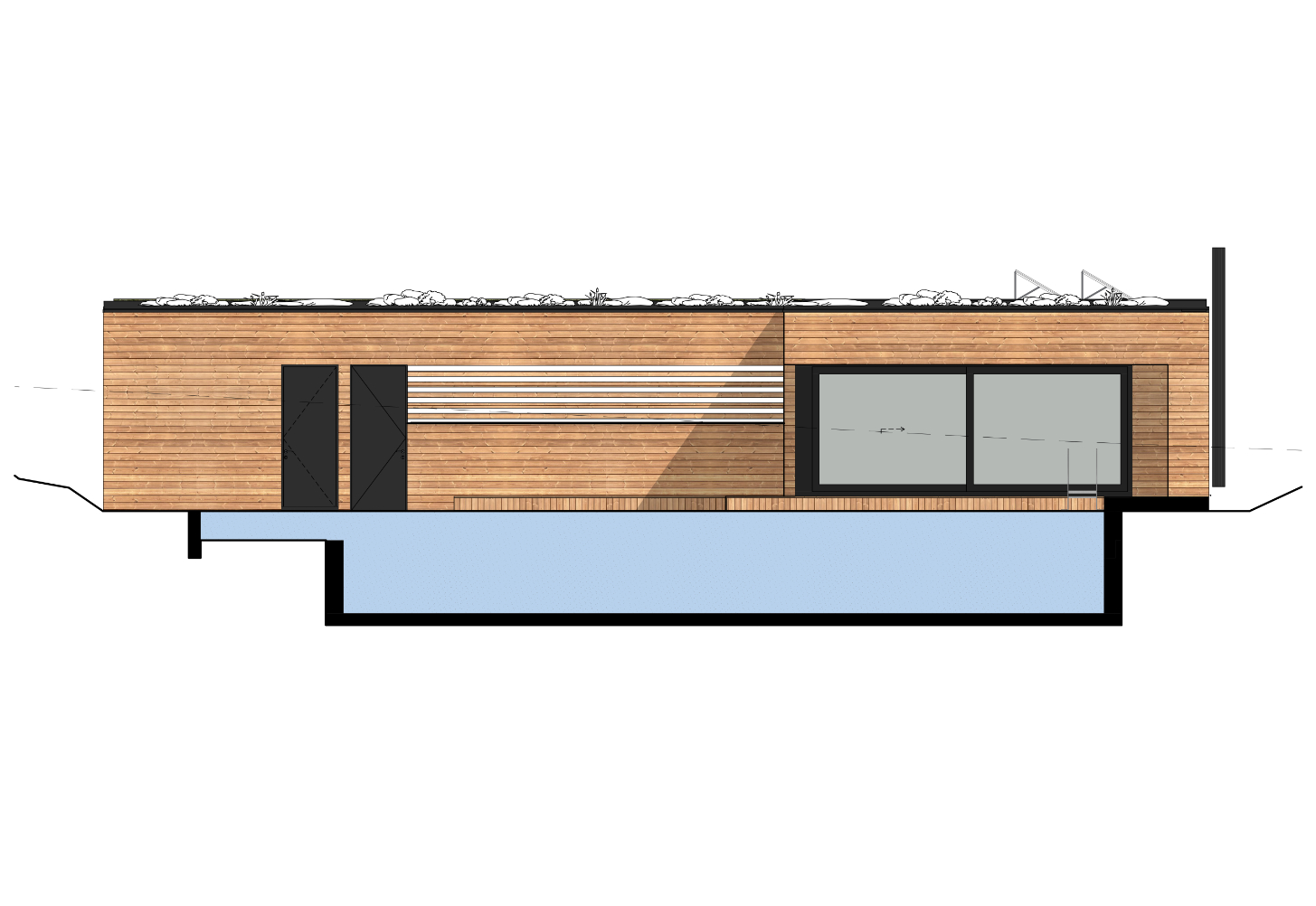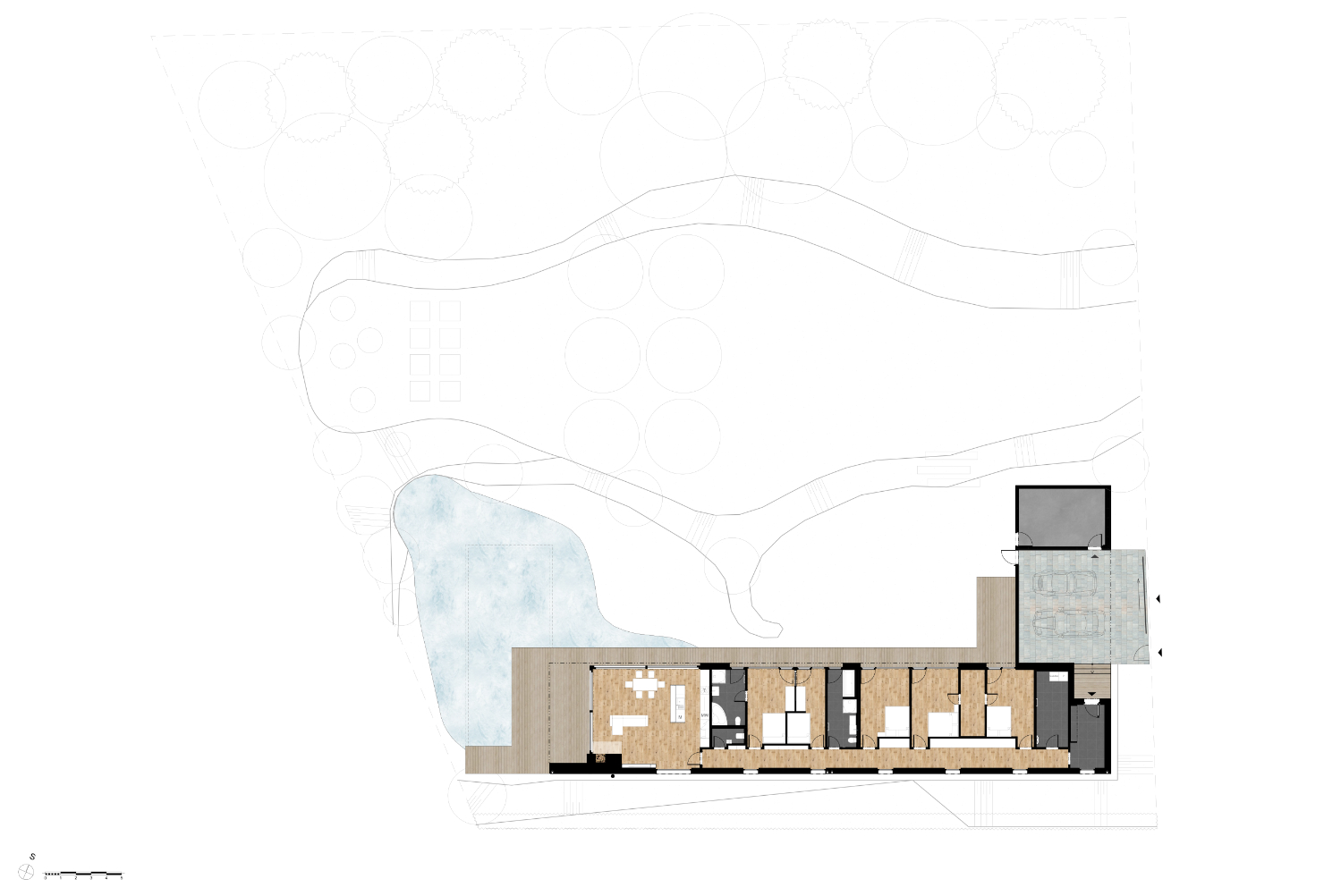 A dominant feature of the garden is the swimming pond, which forms the heart of the home. It connects directly to the wooden terrace off the main living area, becoming both its backdrop and centerpiece. Two large sliding glass portals (HS portals) link the interior to the exterior, merging the living room, terrace, and garden into one living organism.