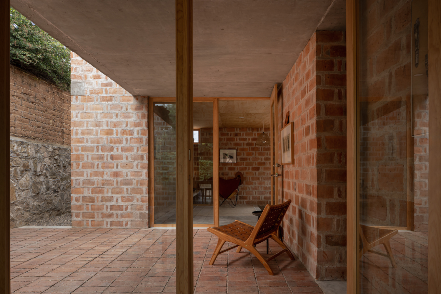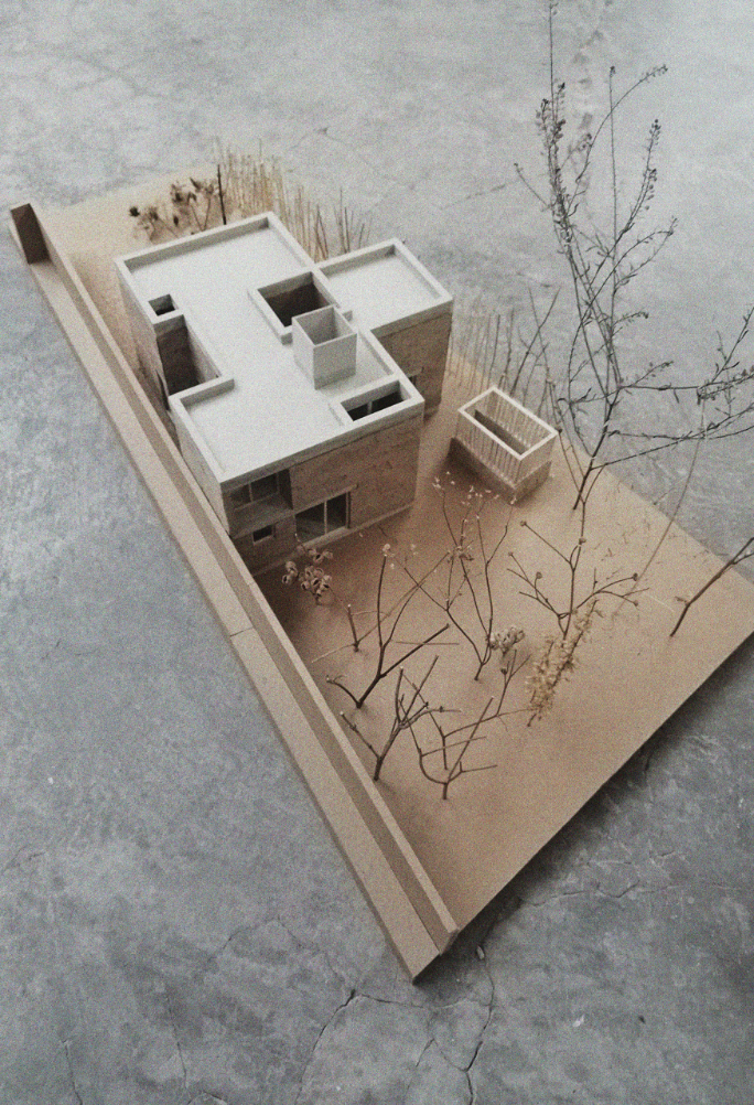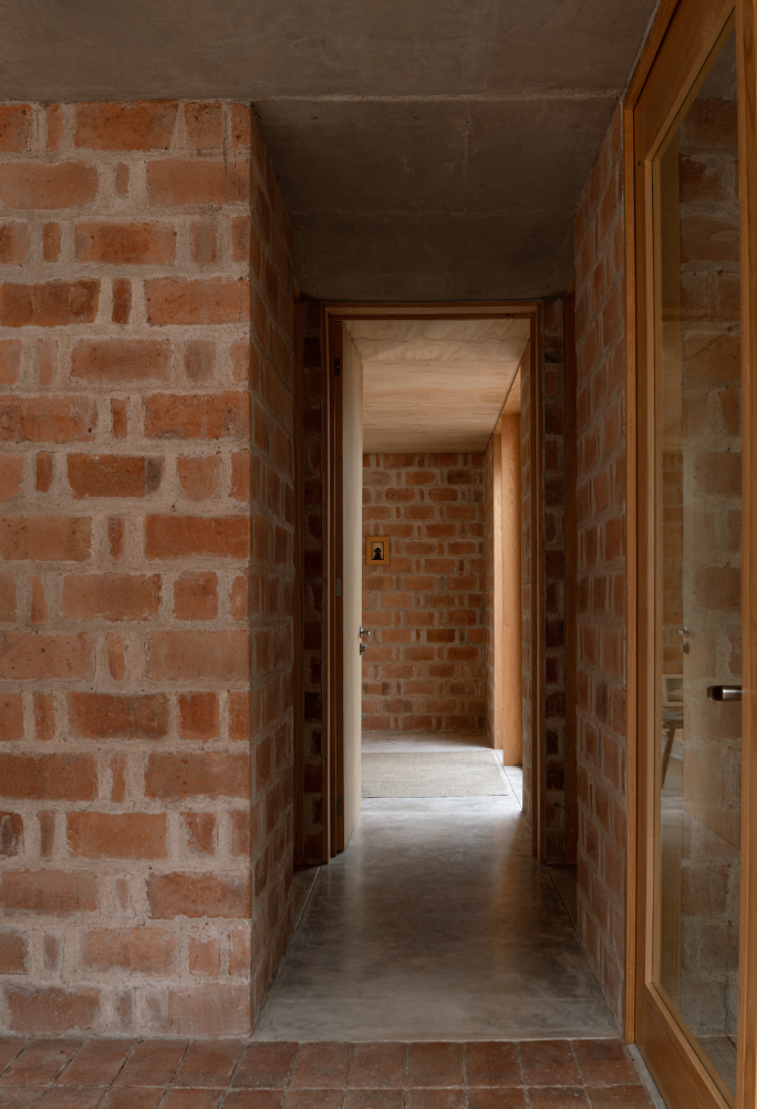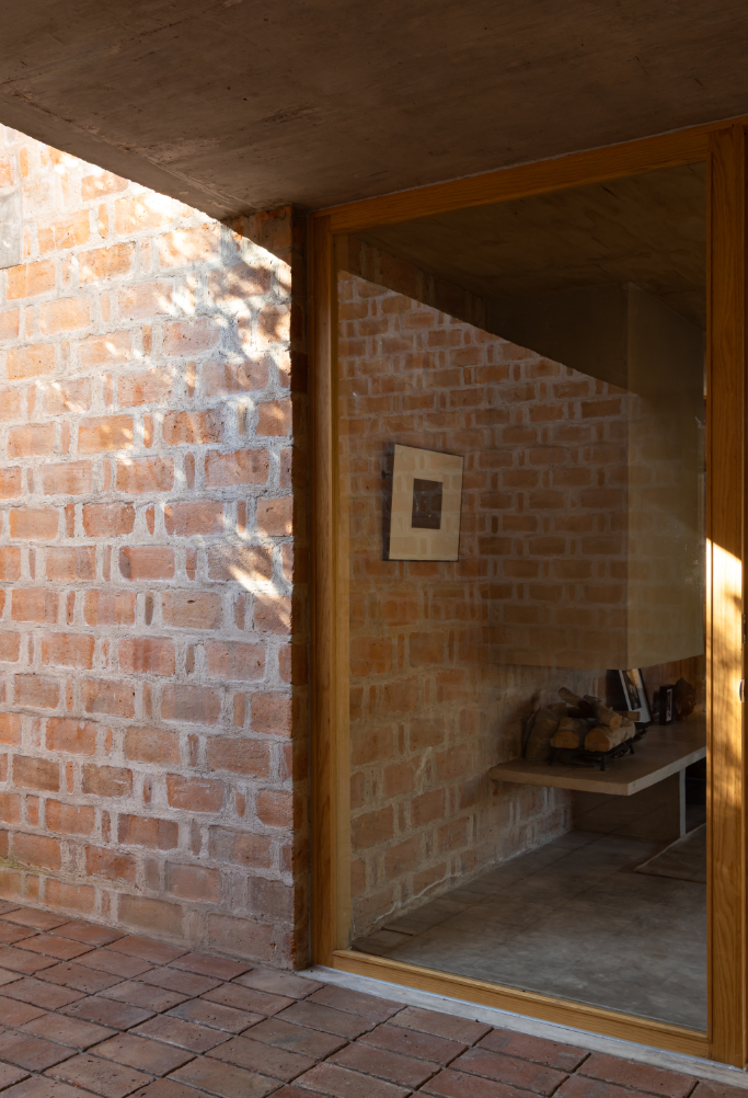 Pečlivě komponované čtvercové otvory ve fasádě vytvářejí přesné vizuální propojení se zahradou, zatímco v centrálním patiu vysoké zdivo moduluje světlo, prohlubuje ticho a vytváří atmosféru odloučení – obzvláště vhodnou pro čtení a rozjímání.