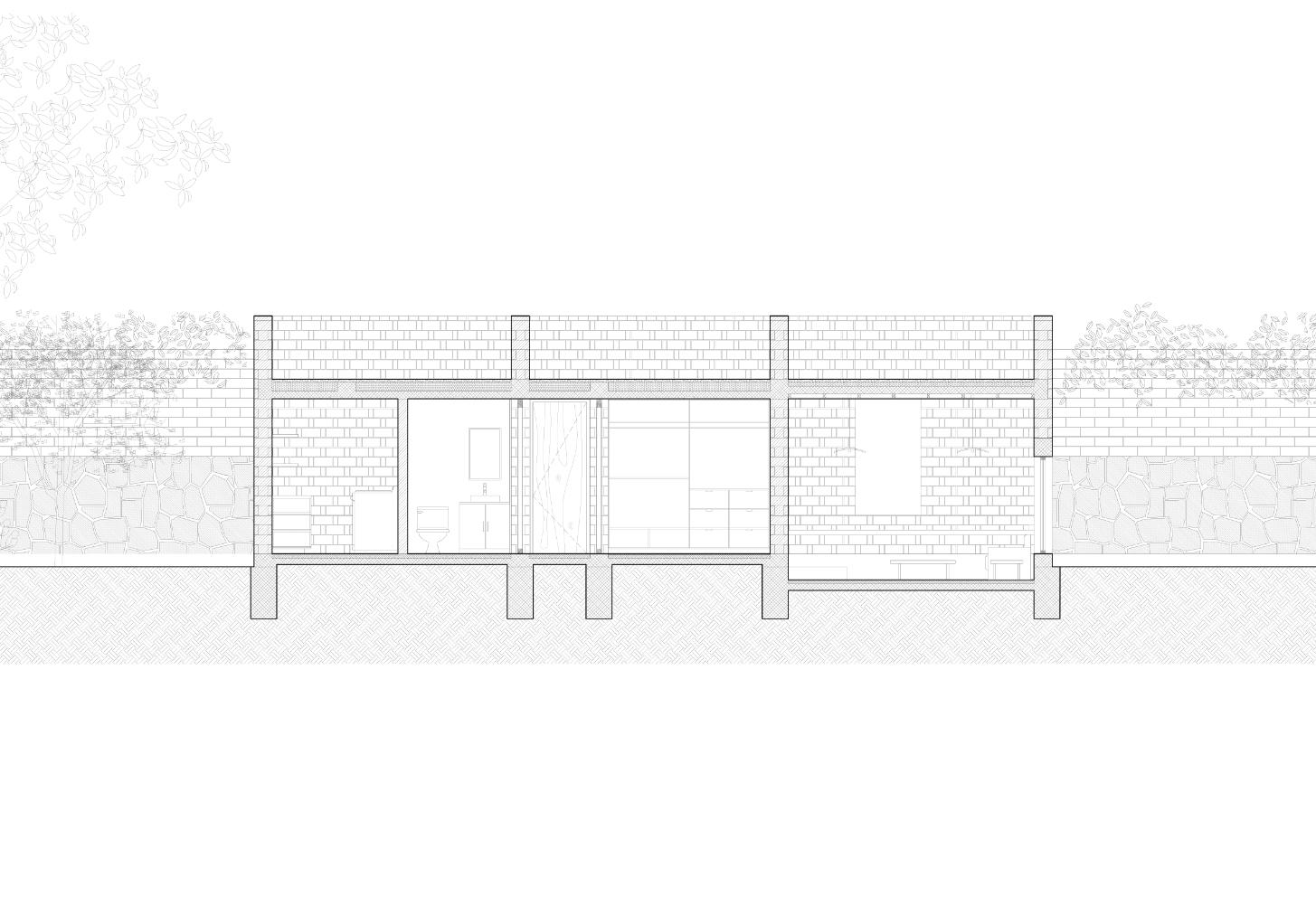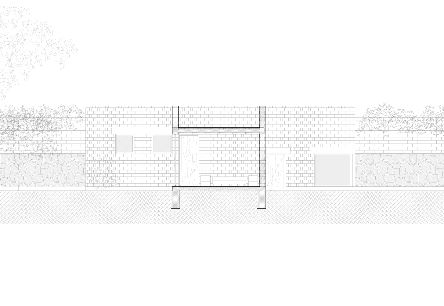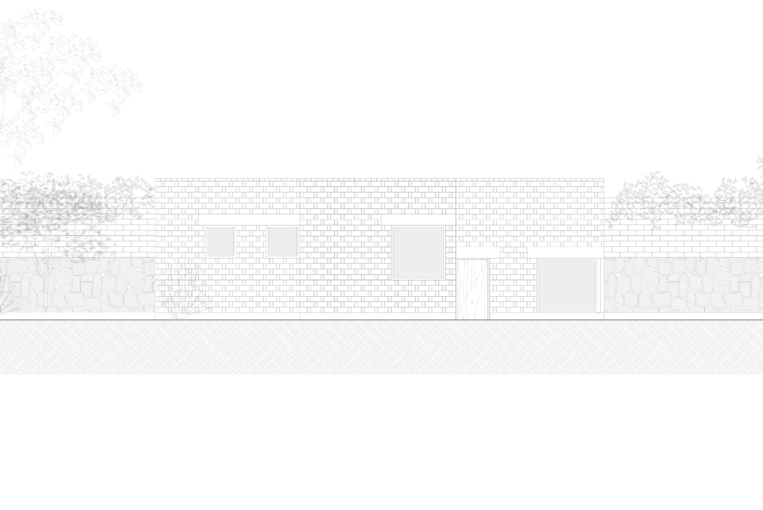 Pečlivě komponované čtvercové otvory ve fasádě vytvářejí přesné vizuální propojení se zahradou, zatímco v centrálním patiu vysoké zdivo moduluje světlo, prohlubuje ticho a vytváří atmosféru odloučení – obzvláště vhodnou pro čtení a rozjímání.