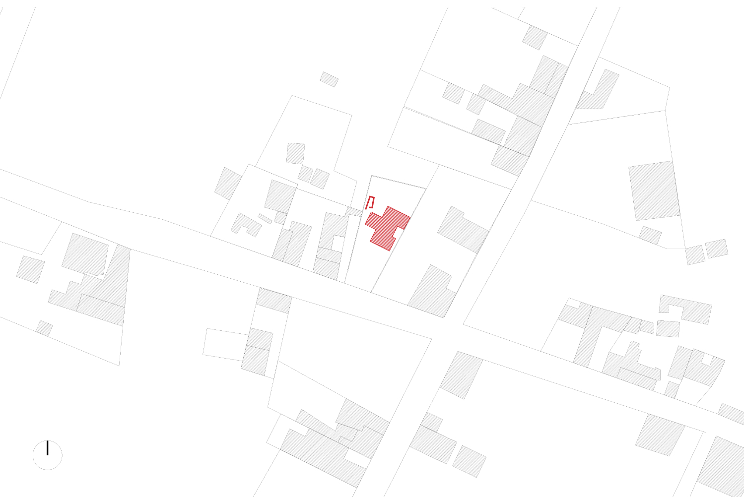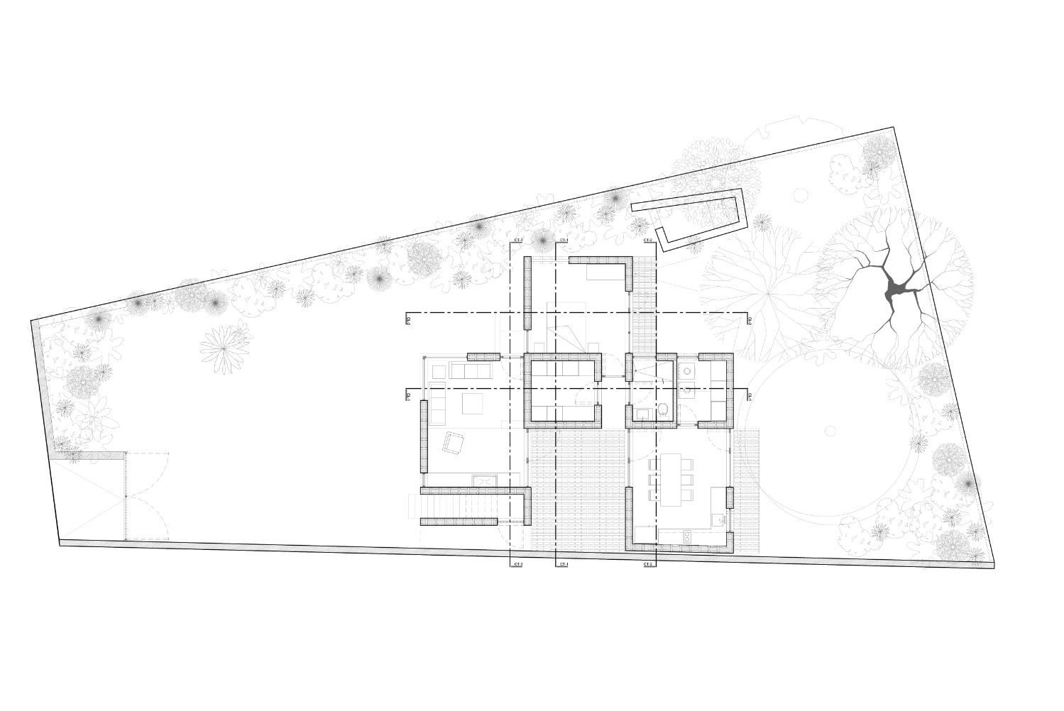 Úzká a nerovná parcela je na východní straně vymezena původní zdí z nepálených cihel a kamene a na západě přirozenou bariérou tvořenou kaktusovým porostem. Klientka si přála mít svůj obytný prostor na jedné úrovni a nad ním byt se dvěma ložnicemi s nezávislým vstupem určený k pronájmu.