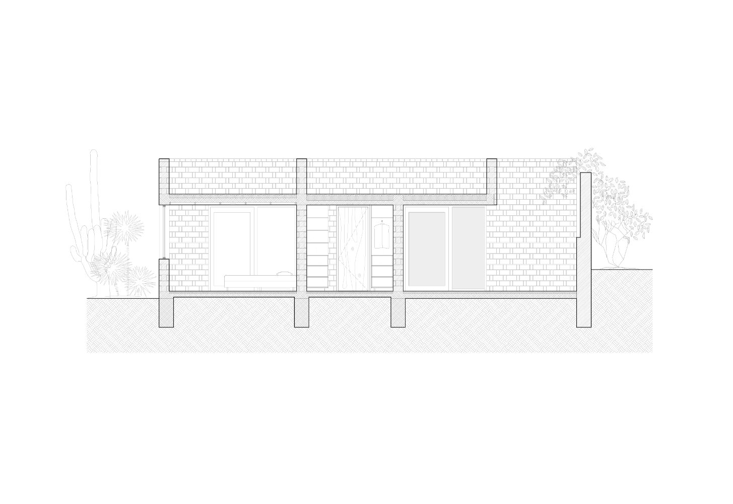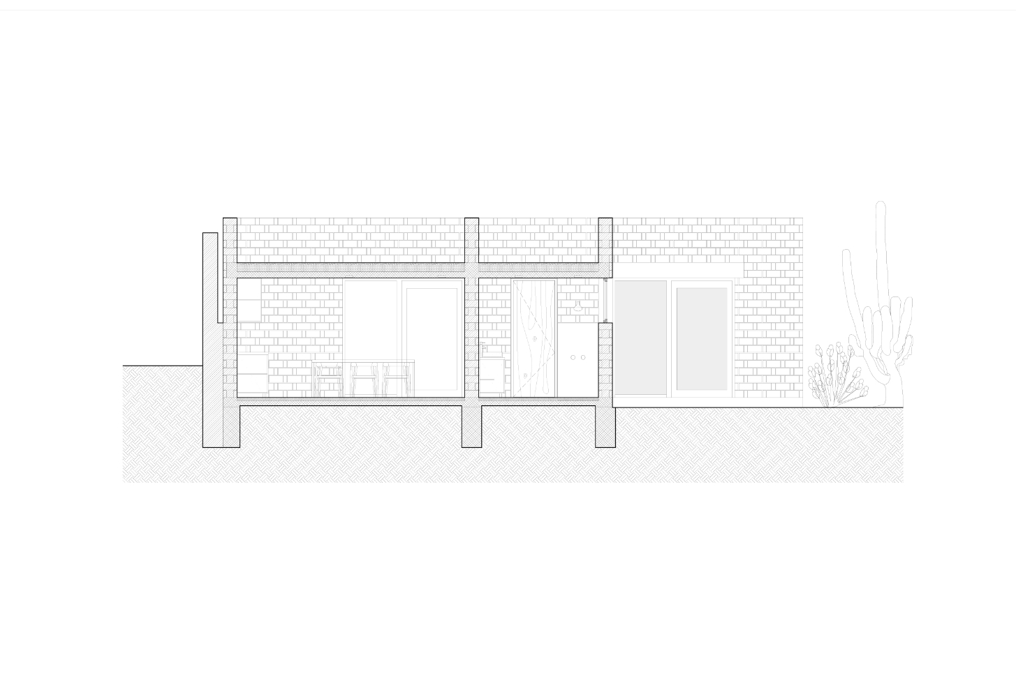 Architektonický koncept využívá původní cihelnou zeď jako linii navadějící příchozího ke vstupu do hlavního obytného prostoru. Do něj se vstupuje přes dvůr, který je vymezen jak zdí, tak samotným domem. Dvůr zároveň funguje jako svébytný organizační prvek, jenž prostřednictvím polootevřeného portiku propojuje všechny obytné prostory v přízemí domu, zatímco byt v patře je uspořádán kolem vlastního centrálního patia. Směrem na západ je dům členěn do tří stupňovitě uspořádaných objemů, což vyrovnává napravidelnou stopu hranice z kaktusů a zároveň se díky tomu objem domu vyhýbá viditelným pozůstatkům těžební šachty. Důležitým aspektem návrhu je také možnost realizovat stavbu v samostatných etapách, což zajišťuje dlouhodobou flexibilitu a přizpůsobivost v průběhu času.