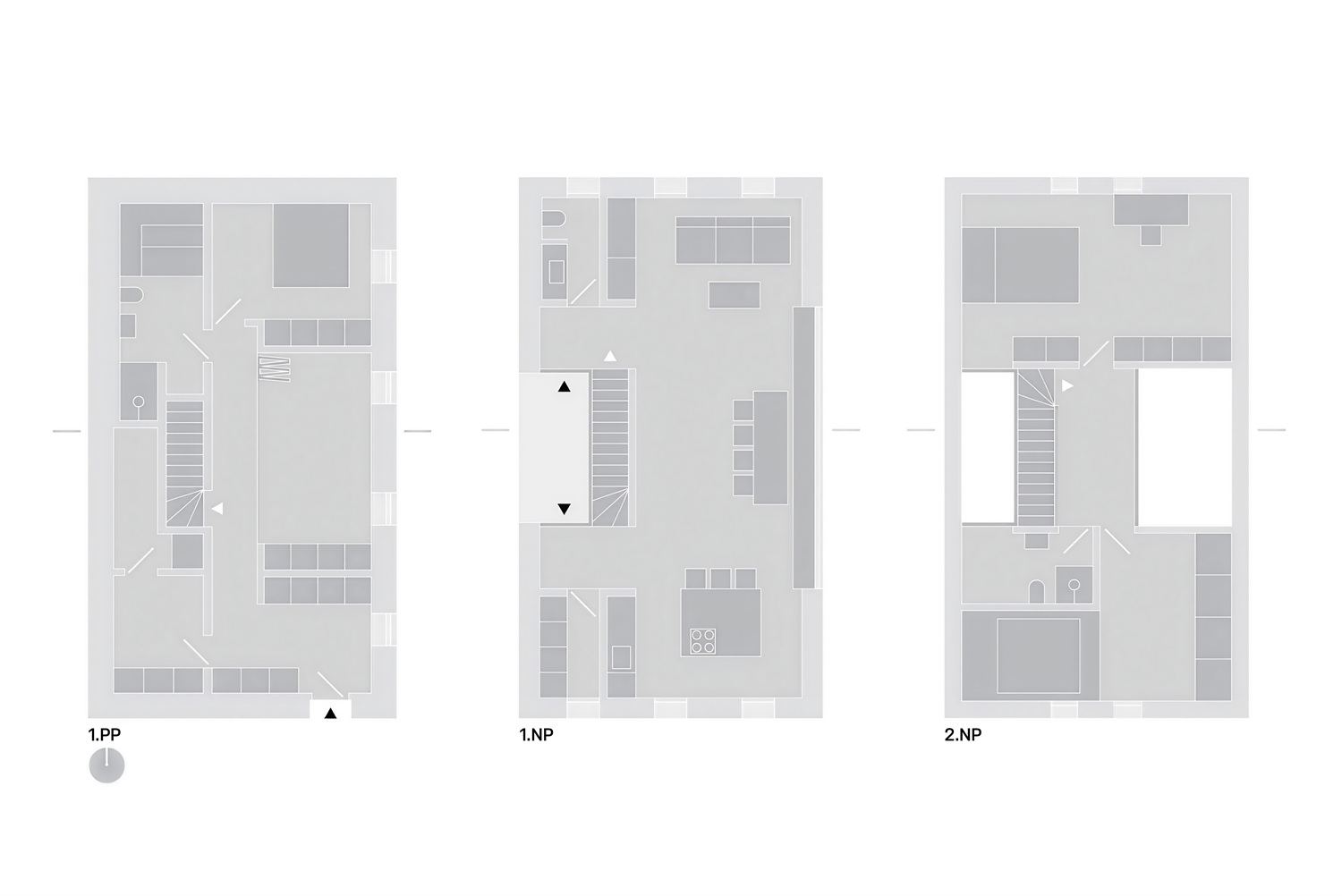 Zvětšení oken na štítových fasádách možné nebylo, protože by narušilo jejich proporce a výsledek by působil nesourodě. Vedle velkoformátového prosklení proto studio edit! architects aplikovalo princip vertikálního propojení podlaží. Díky tomu vznikl ochoz nad obývací částí a přízemí se mohlo otevřít až do krovu. Řešení umožňuje přístup denního světla z více směrů a vytváří pocit vzdušného a světlého prostoru.