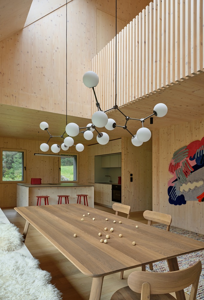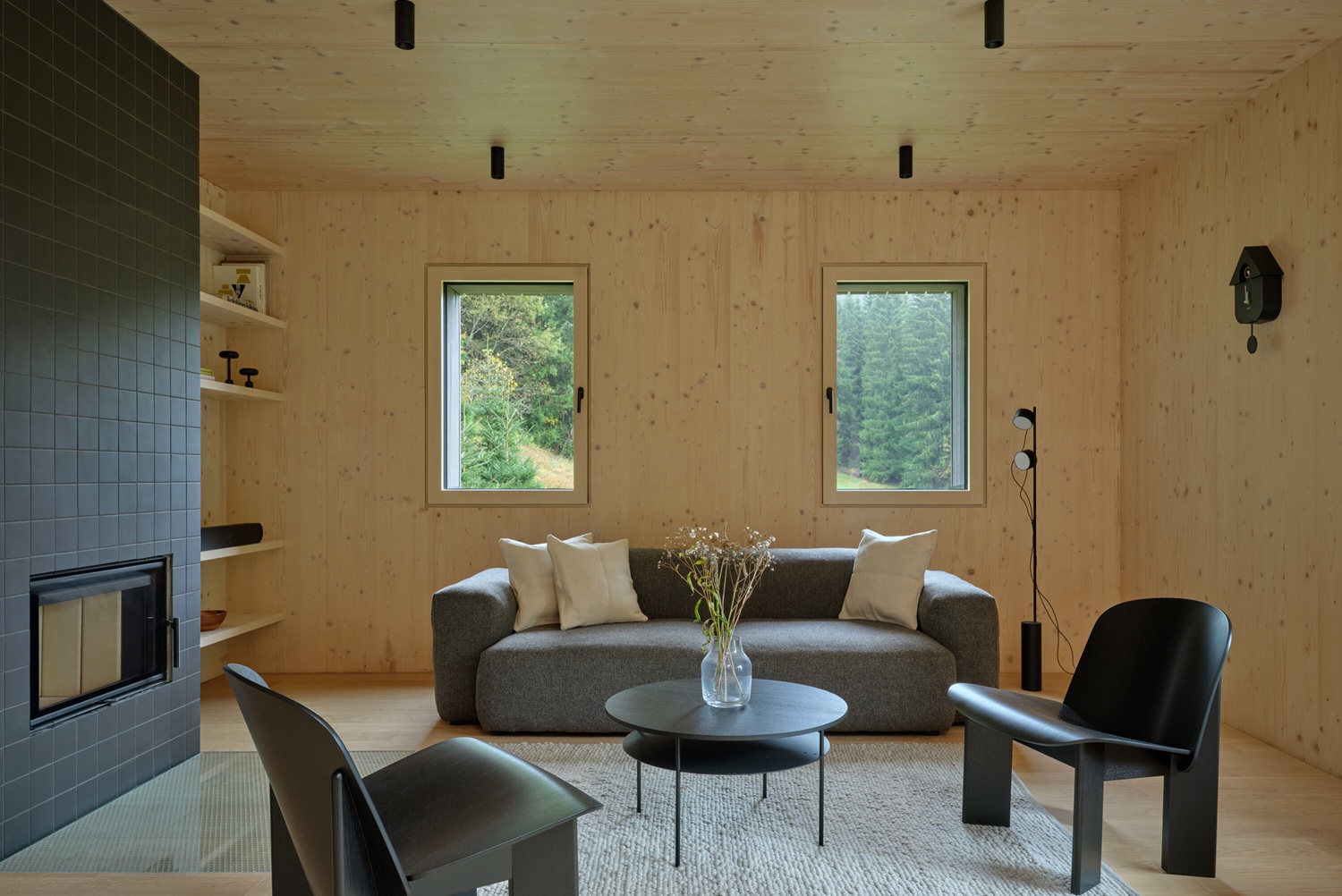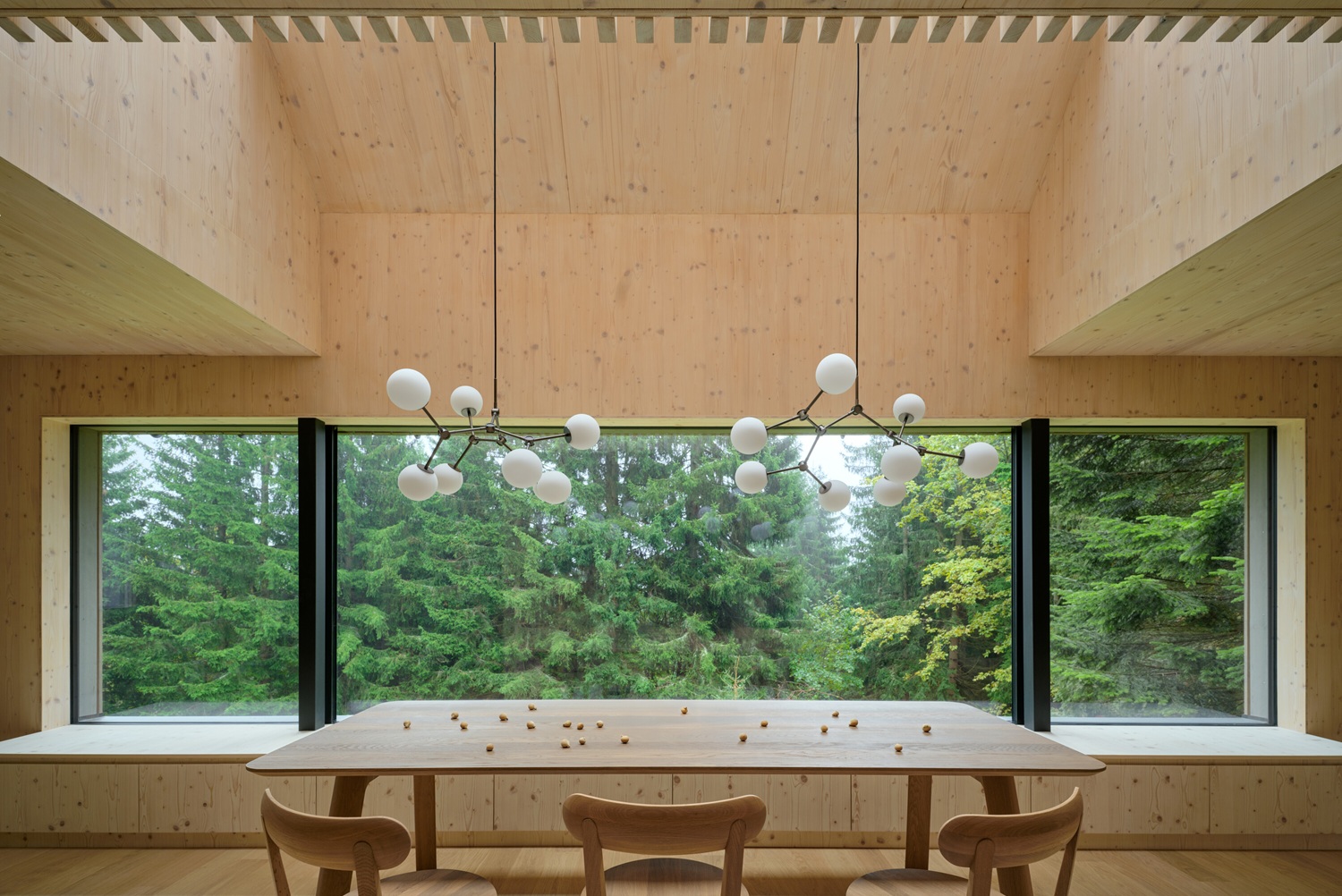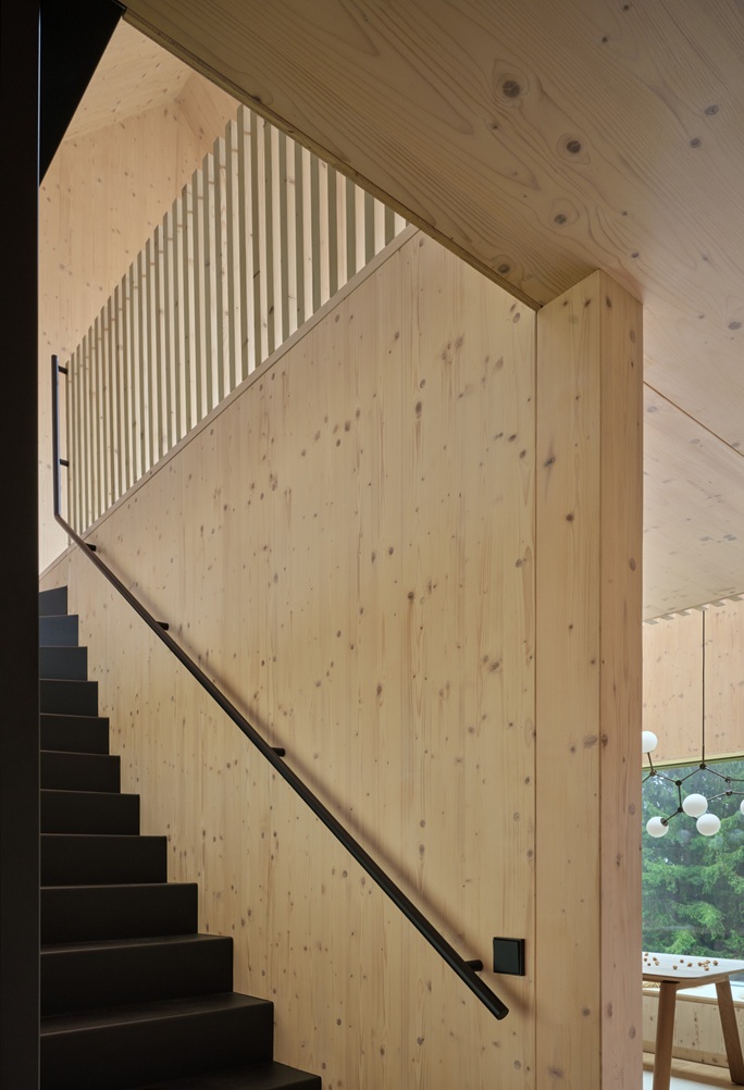 Realizace projektu byla logisticky náročná. Komplikace přineslo umístění ve strmém svahu i zkrácená stavební sezona, která vyžaduje rychlý postup výstavby. I proto se prefabrikované CLT panely, jež je možné smontovat na železobetonový sokl během několika týdnů, ukázaly jako ideální řešení. Tyto dřevěné panely nabízejí statickou tuhost srovnatelnou s betonem, což umožňuje vytvořit rozsáhlé průhledy a otevřené zóny – řešení, které konvenční konstrukce standardně neposkytují. Panely jsou společností 3AE dodávány v pohledové kvalitě, díky čemuž dřevěný povrch stěn a stropů tvoří finální interiér, jenž nevyžaduje další obklady.