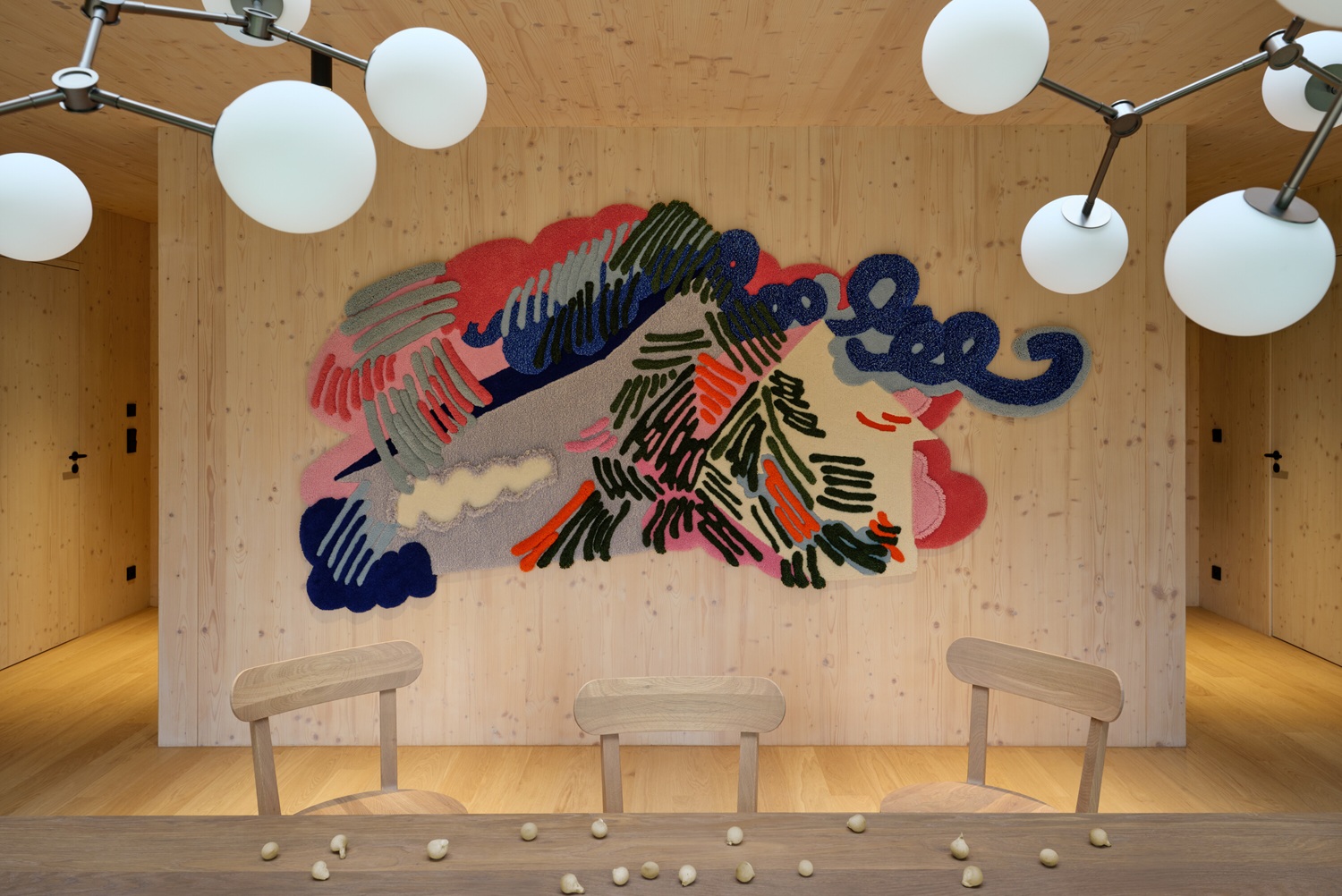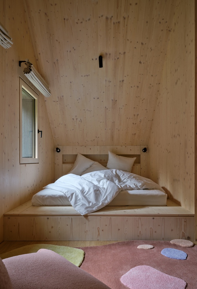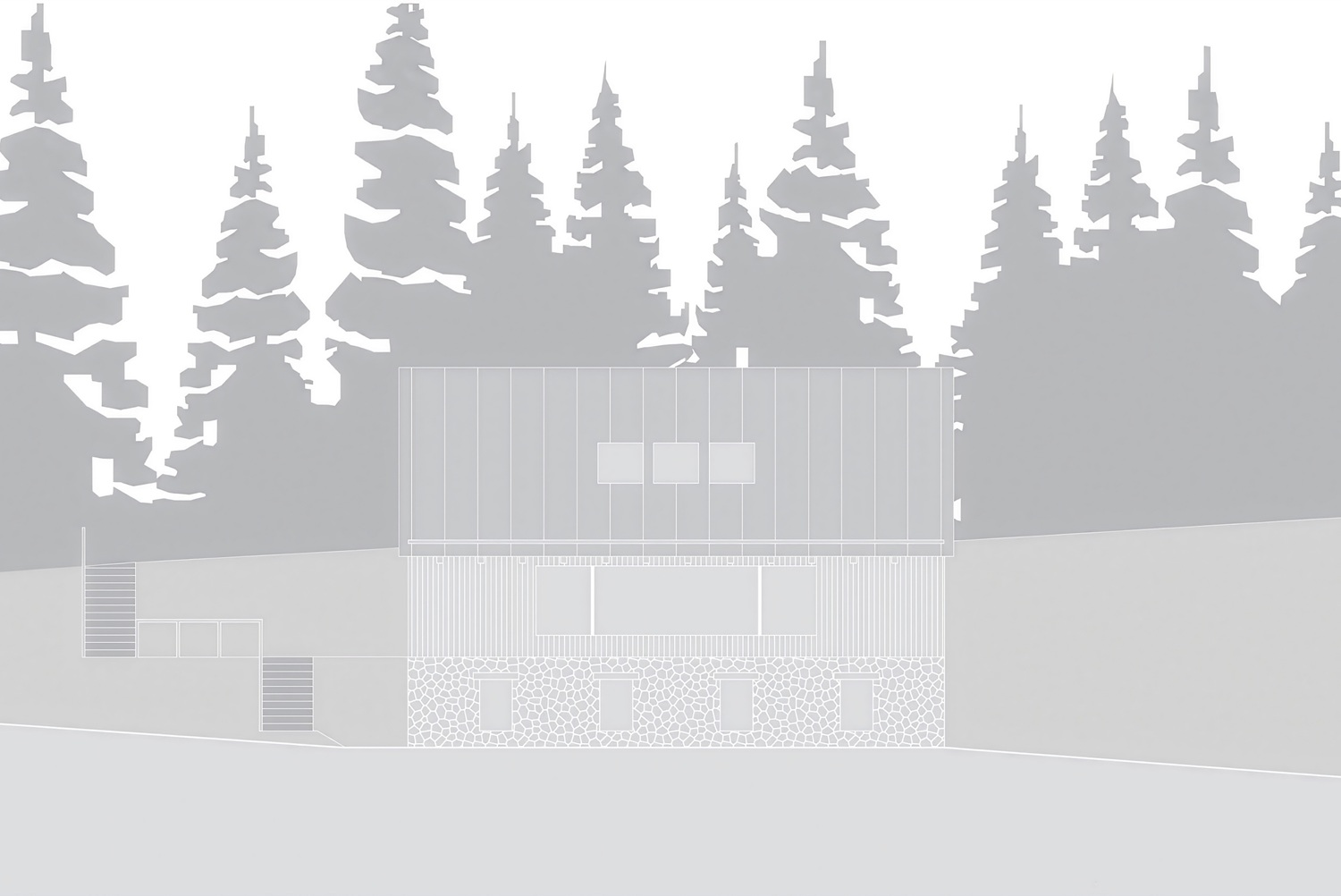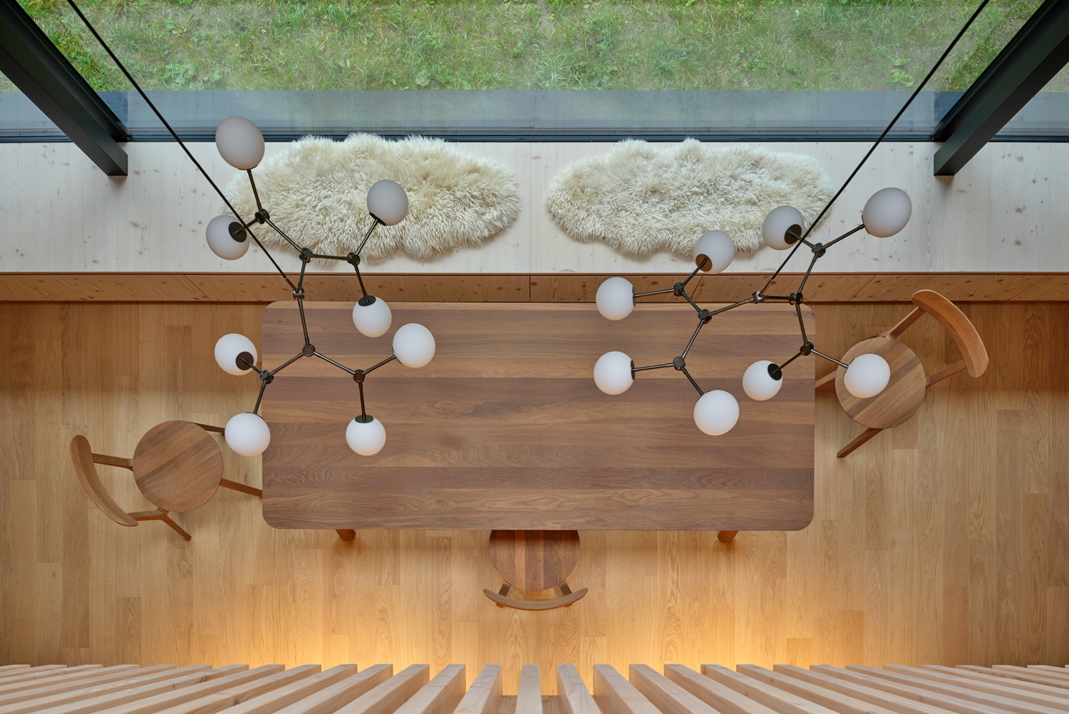 Realizace projektu byla logisticky náročná. Komplikace přineslo umístění ve strmém svahu i zkrácená stavební sezona, která vyžaduje rychlý postup výstavby. I proto se prefabrikované CLT panely, jež je možné smontovat na železobetonový sokl během několika týdnů, ukázaly jako ideální řešení. Tyto dřevěné panely nabízejí statickou tuhost srovnatelnou s betonem, což umožňuje vytvořit rozsáhlé průhledy a otevřené zóny – řešení, které konvenční konstrukce standardně neposkytují. Panely jsou společností 3AE dodávány v pohledové kvalitě, díky čemuž dřevěný povrch stěn a stropů tvoří finální interiér, jenž nevyžaduje další obklady.