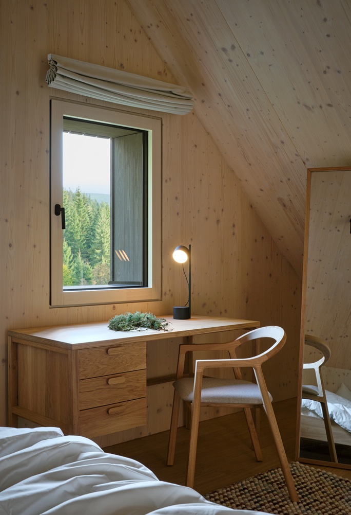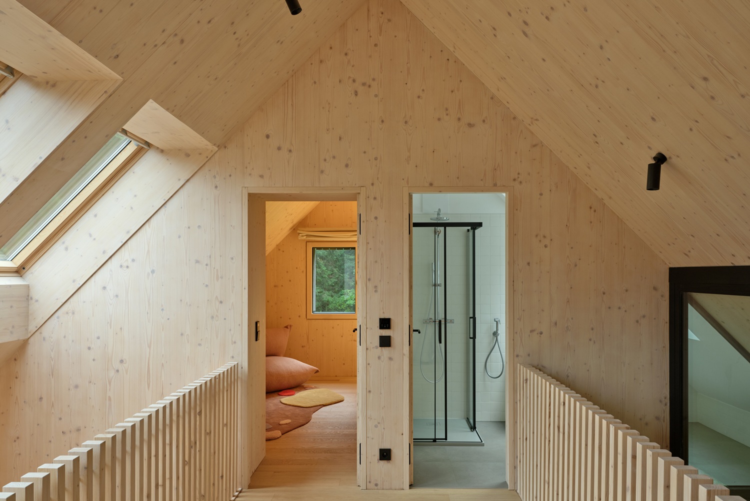„Zatímco oba štíty musely zůstat striktně tradiční, boční fasády nám poskytly prostor pro moderní architektonické prvky. To nám umožnilo implementovat velkoformátové prosklení v hlavní obytné zóně a v místě letního vstupu a maximalizovat tak průhledy do okolní krajiny. Vizuální kontakt s přírodou je klíčový a výrazně umocňuje celkový zážitek z pobytu na horách,“ upřesňuje Juraj Calaj ze studia edit! architects.