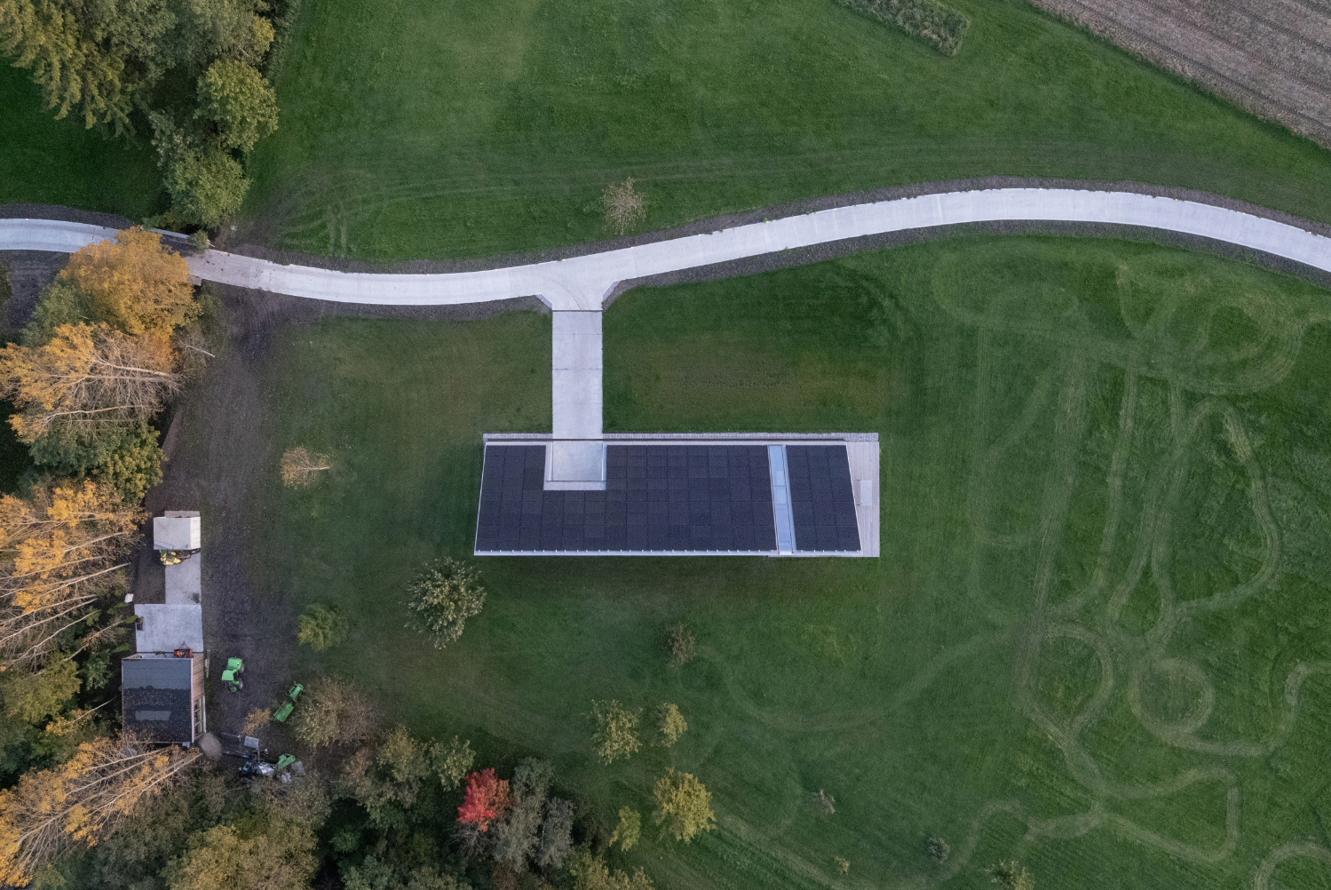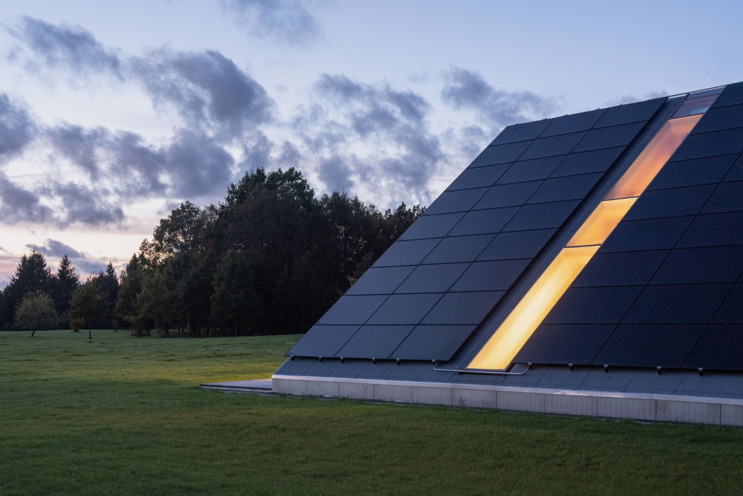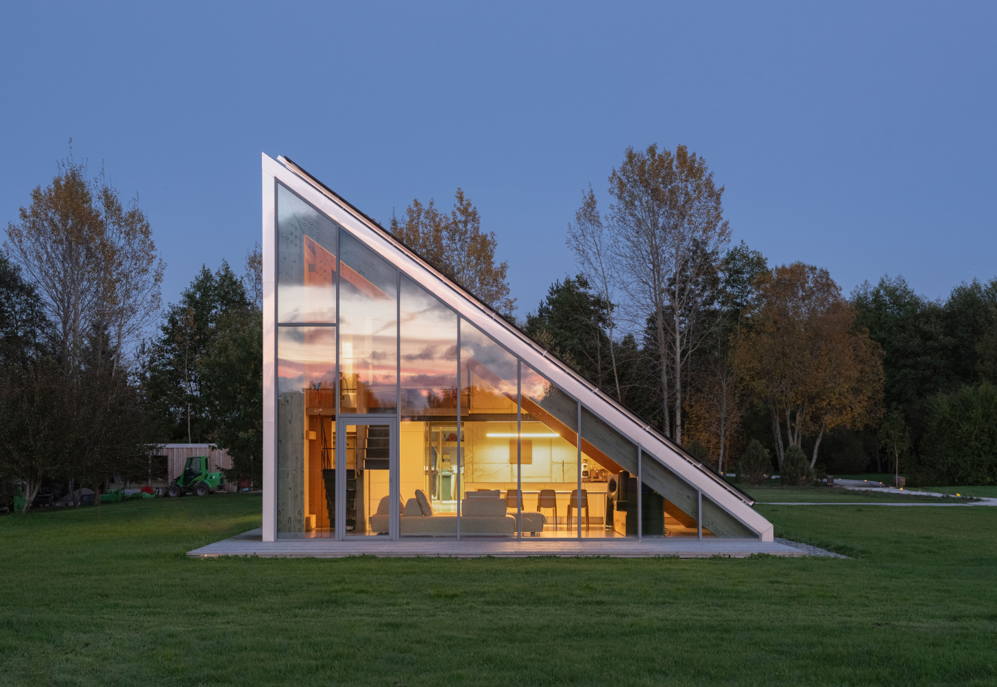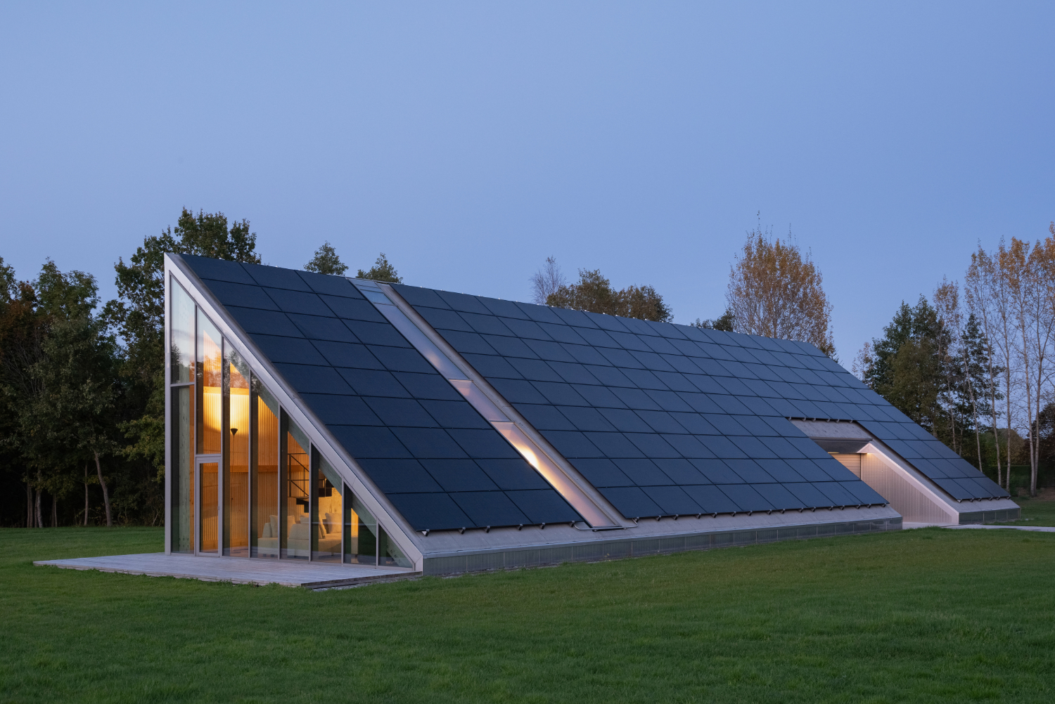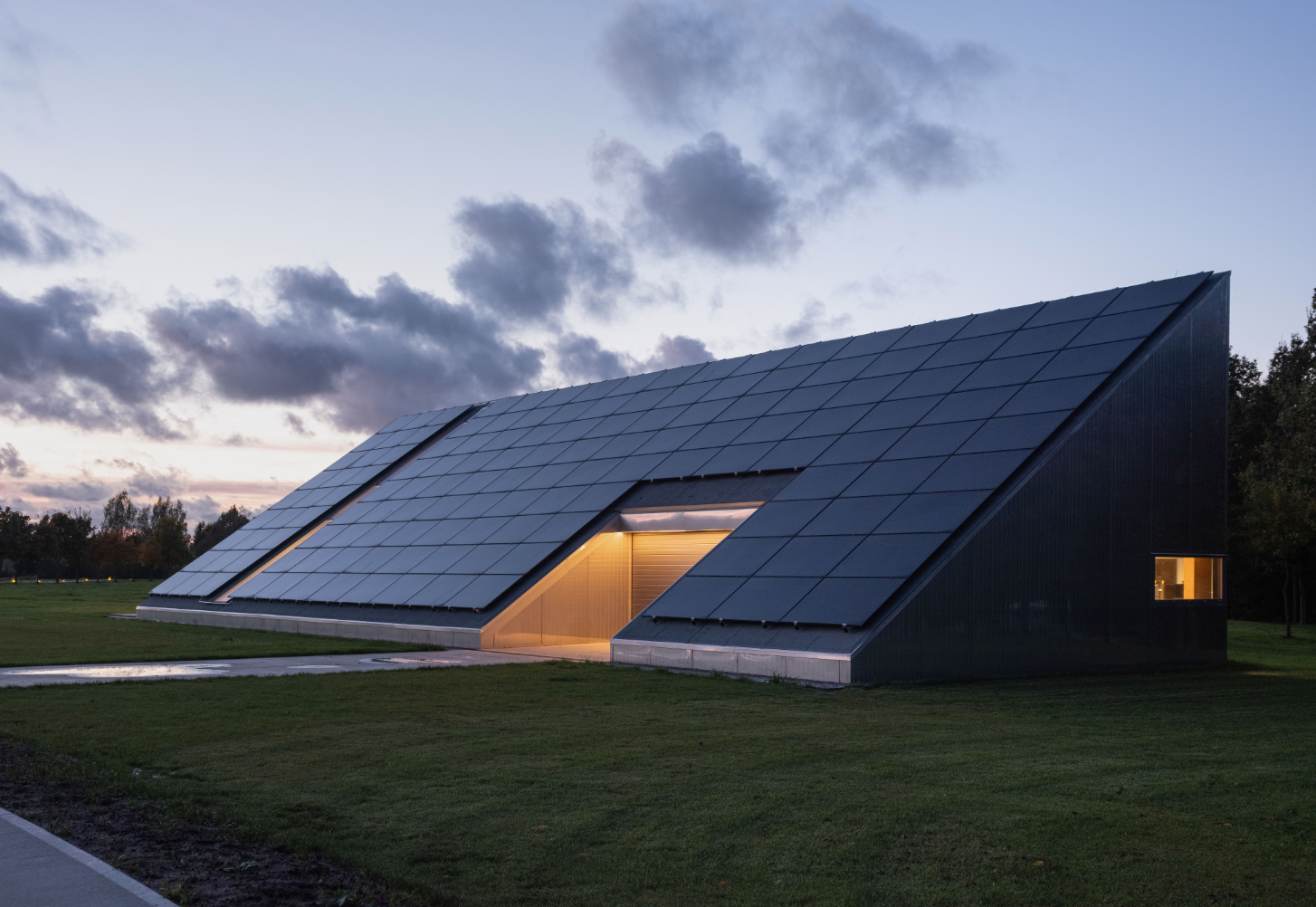 Navenek si dům v Utriai zachovává uzavřený, téměř tajemný charakter. Jednostranně skloněný objem je obložen jednotnou fasádou z panelů z nerezové oceli – materiálu nenáročného na údržbu, jež je trvanlivý a univerzálně použitelný. Pětatřicetiprocentní sklon střechy nejen formuje dynamickou siluetu budovy, ale zároveň díky nainstalovanému fotovoltaickému systému umožňuje její energetickou soběstačnost.