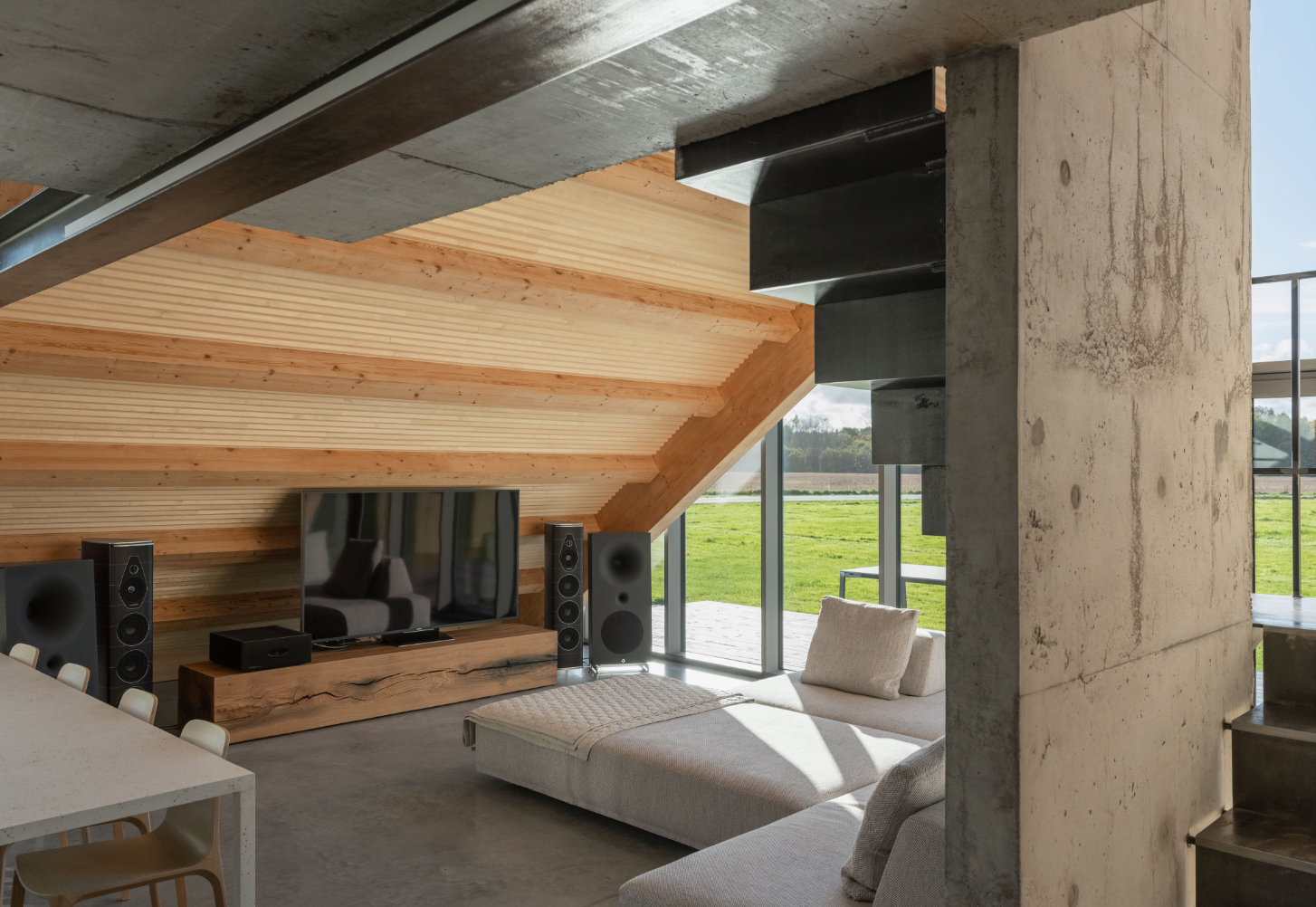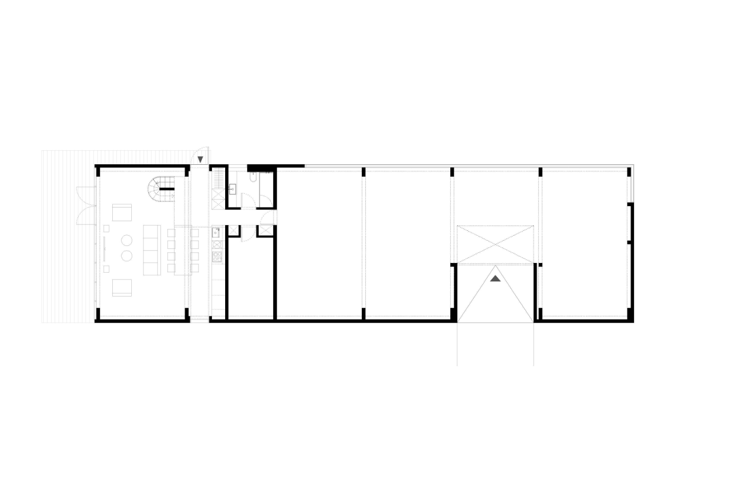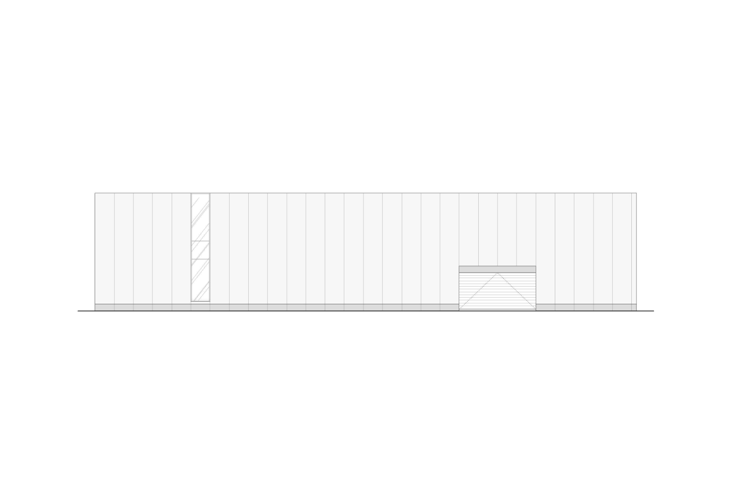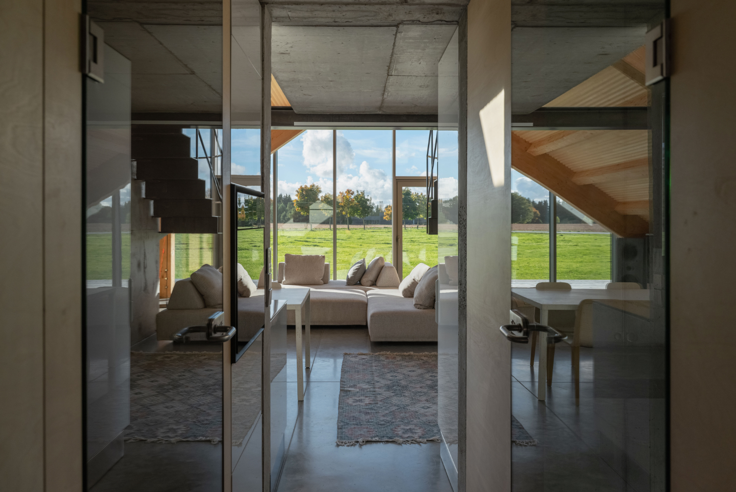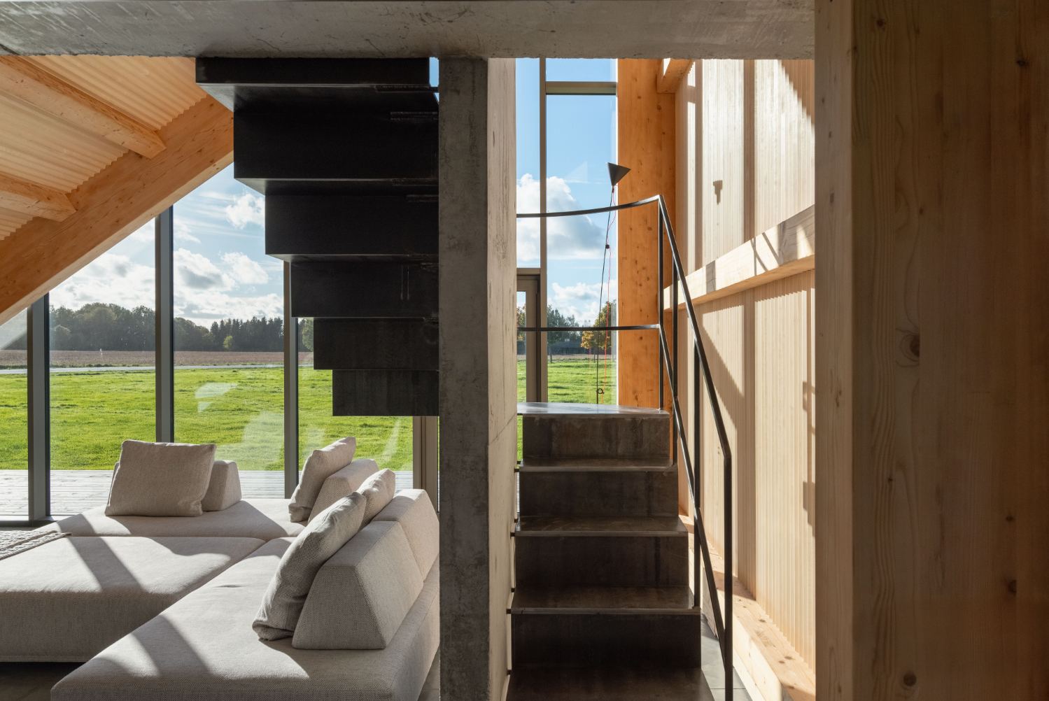 Základním konceptem domu v Utriai je flexibilita. Jeho dispozice je jasně rozdělena do dvou zón, které – přestože jsou pod jednou střechou – slouží odlišným scénářům užívání. Větší část objemu je věnována skladování – jde o vysoký, otevřený prostor přístupný širokými sekčními vraty, jenž je ideální pro umístění zemědělské techniky.