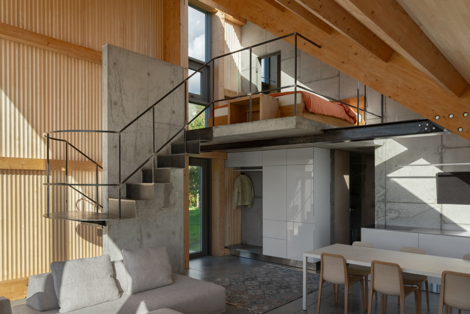 Západní část domu se samostatným vstupem má drobnější měřítko. Díky dispozičnímu řešení, které do interiéru přivádí dostatek denního světla, se její funkce může během dne měnit: přes den může sloužit jako dílna či pracovna, večer se z ní může stát plnohodnotné obytné zázemí pro hosty s výhledem do krajiny.