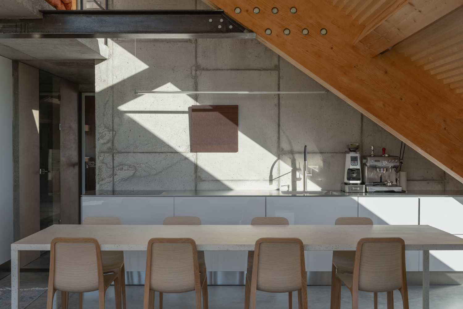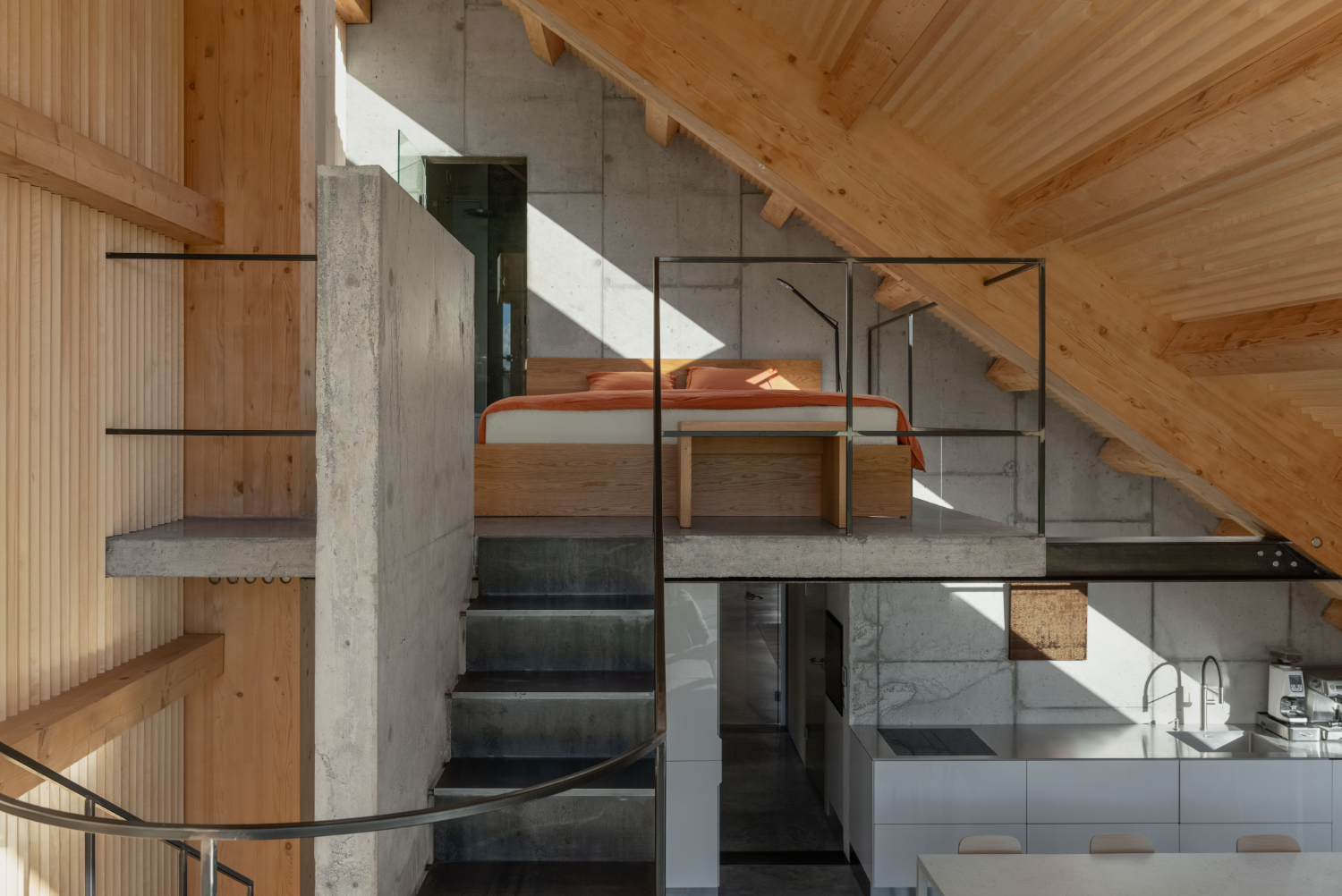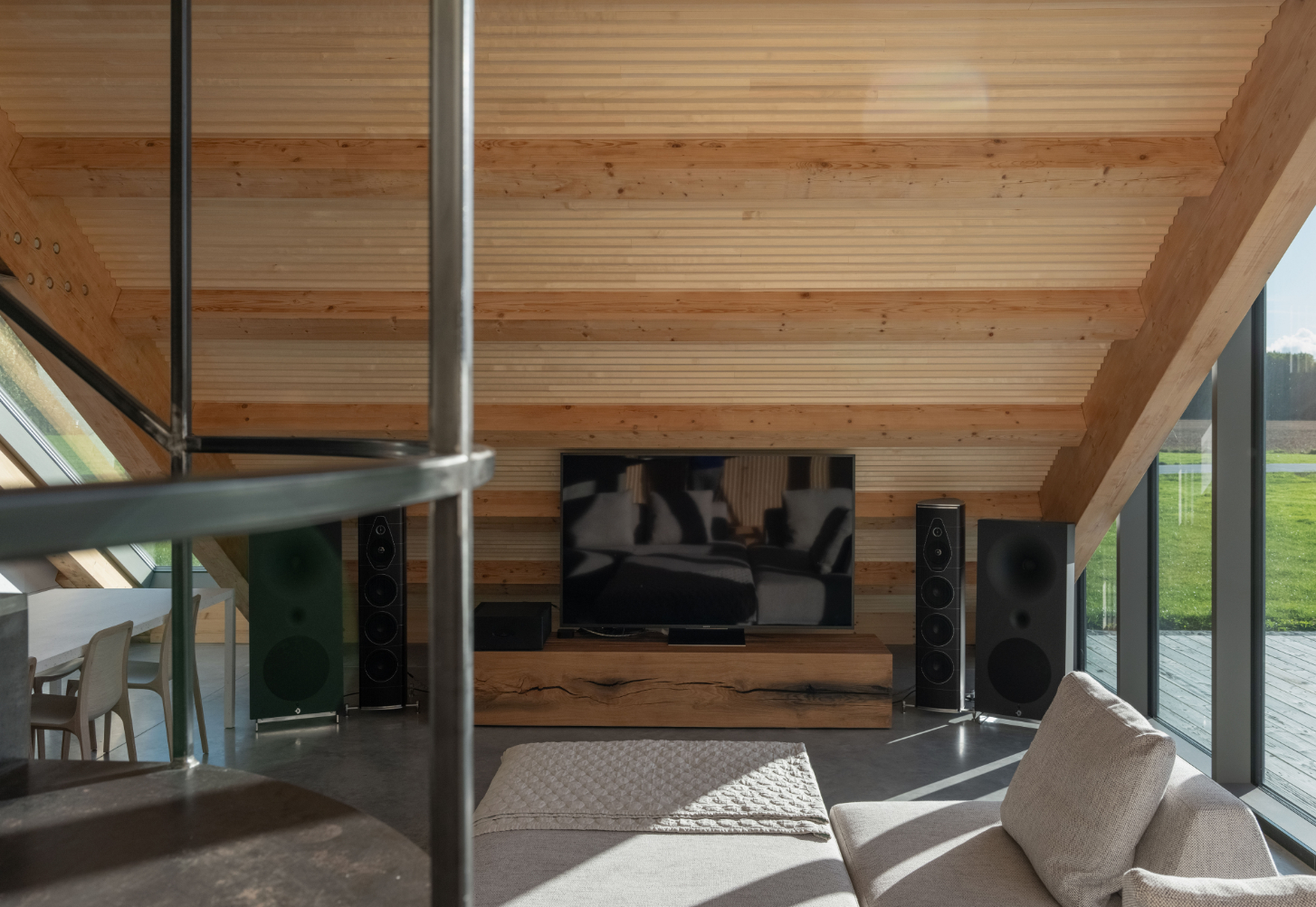Velkoryse prosklená západní fasáda rámuje západy slunce, zatímco nejvýraznější prvek – střešní světlík, který přechází do vertikálního okna na severní fasádě – zajišťuje osvětlení i těch nejhlouběji umístěných částech objektu. Mezipatro tak nepůsobí jako podkroví, ale spíše jako otevřená pozorovatelna.