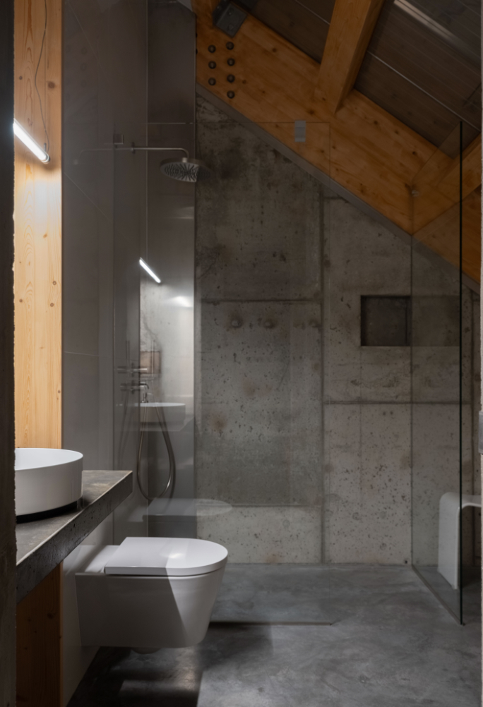 Neobvyklou útulnost, jež bývá u hospodářských staveb spíše výjimkou, podporuje volba kvalitních a přírodních materiálů. Charakter interiéru formují přiznané konstrukce z lepeného lamelového dřeva, které do prostoru vnášejí rytmus a pocit tepla, čímž zjemňují industriální ráz leštěných betonových podlah. Tato kombinace materiálů vytváří estetiku připomínající loftové byty – tedy prostory, jež poskytují místo jak pro práci, tak pro nerušený odpočinek.