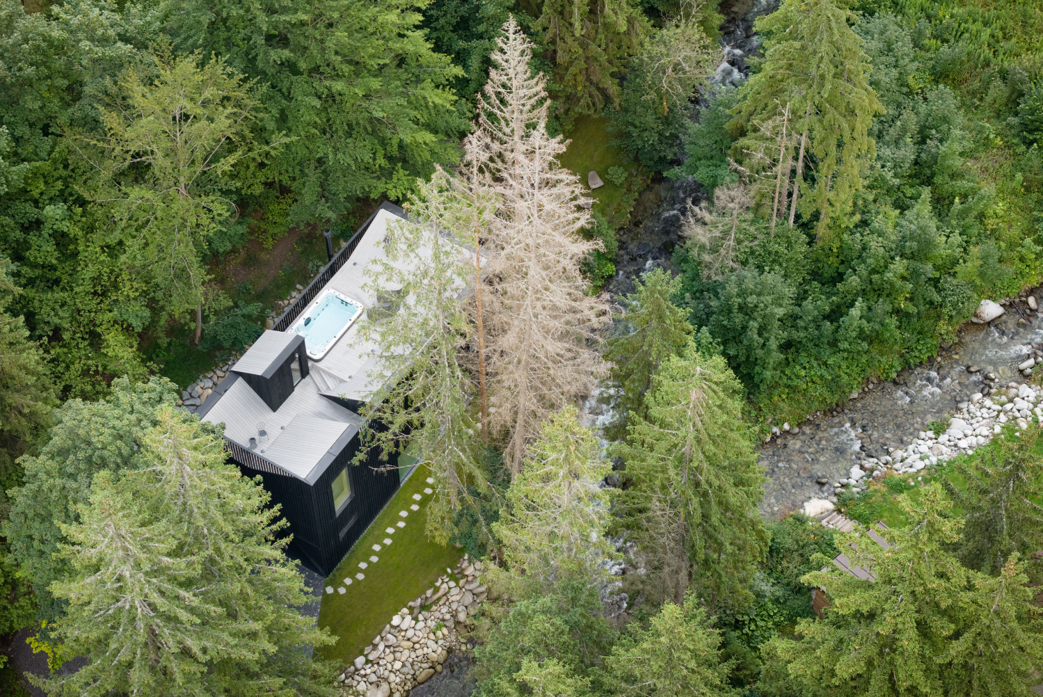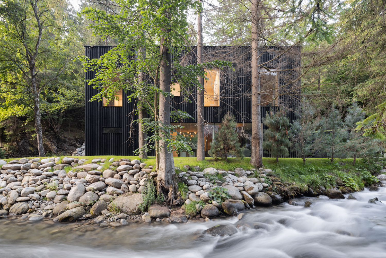 Prostorové řešení objektu reaguje na bezprostřední okolí, jemuž dominuje říčka Demänovka, jejíž vizuální i environmentální kvalita je hlavním determinantem návrhu. Stavební objem elementárního tvaru hranolu, rafinovaně skrytého mezi stromy, se vine paralelně s vodním tokem tak, aby byl vizuálně co nejvíce přítomen v interiéru. Stejný princip vizuálního a akustického propojení s říčkou je aplikován i u trojice ložnic v patře, z nichž každá má svou vlastní koupelnu. Pobytová střecha s vířivkou je pojata jako „inverzní“ – šikmá zastřešení ložnic na ní vytvářejí relaxační plochy. Prostorový negativ střešní krajiny umožňuje dosáhnout maximální intimity navzdory vizuální blízkosti sousedních rekreačních chat a zároveň podporuje vnímání nekonečné vertikály oblohy rámované korunami stromů.