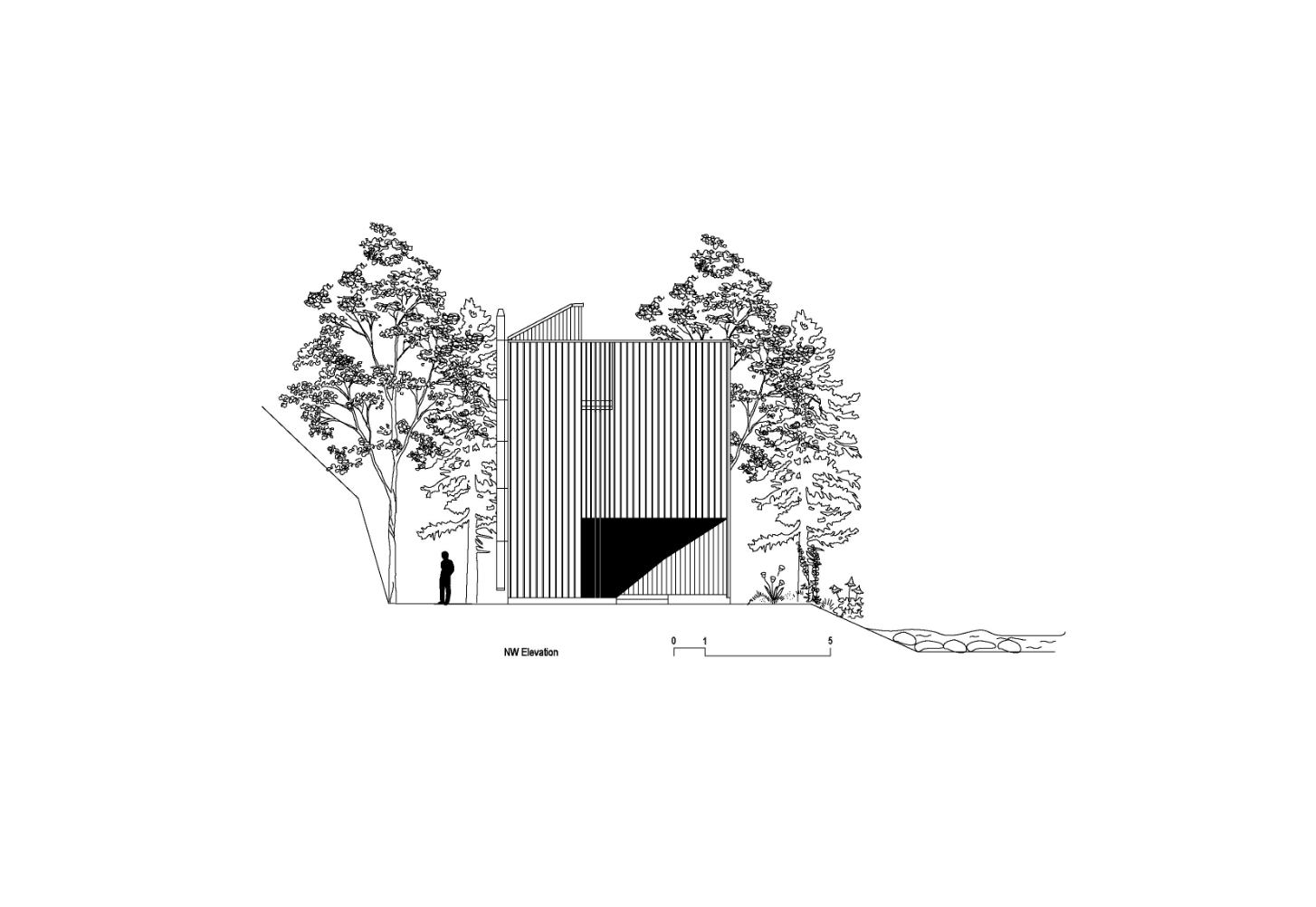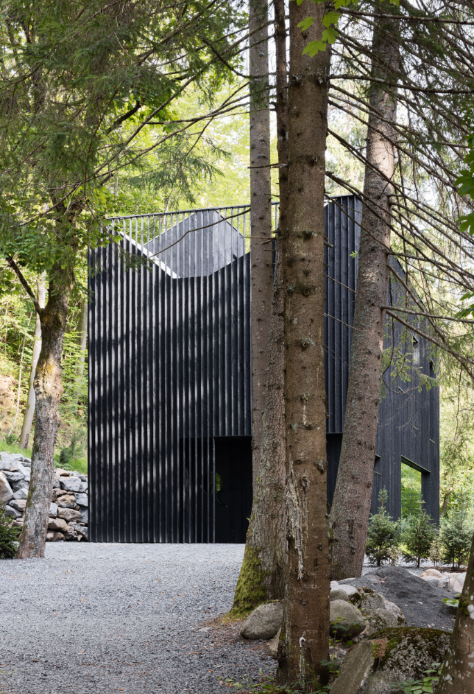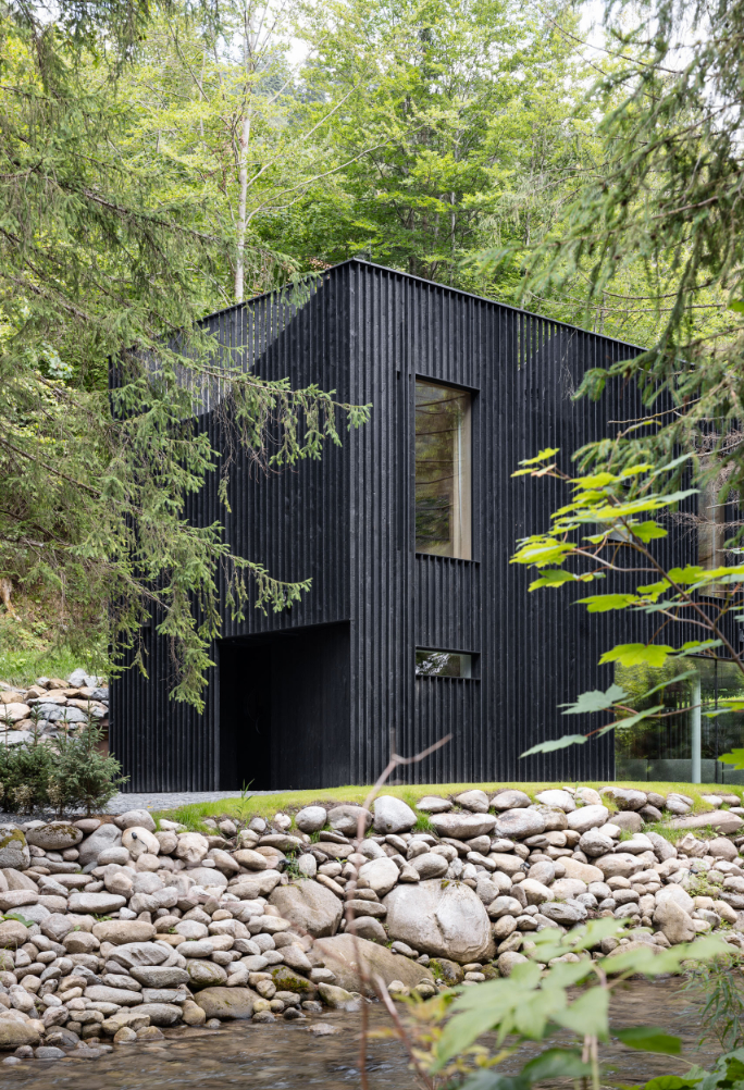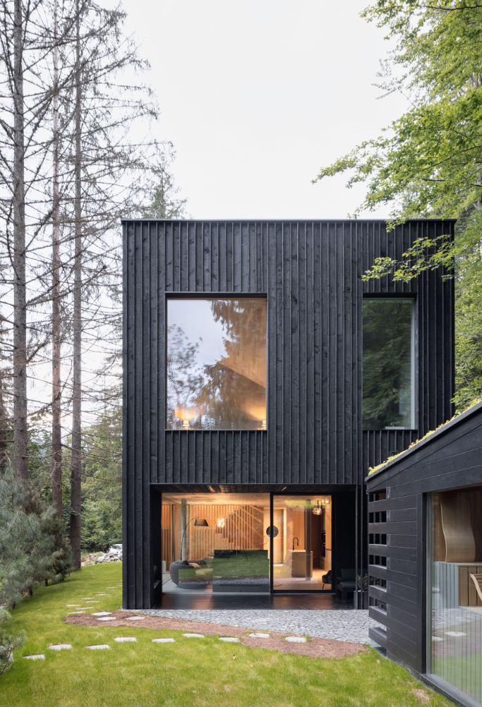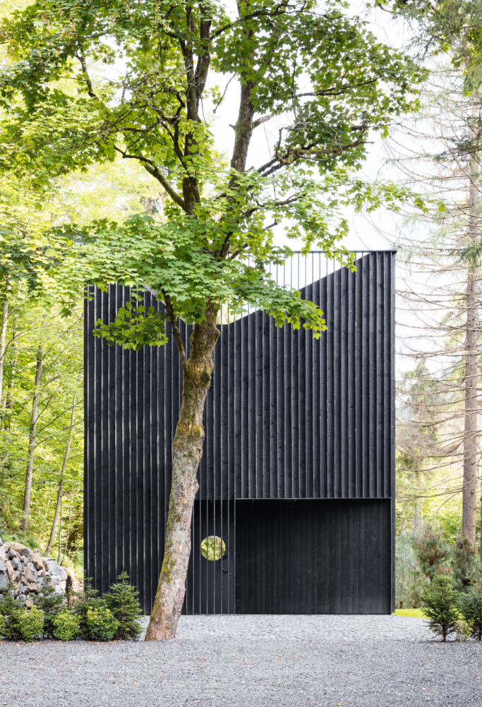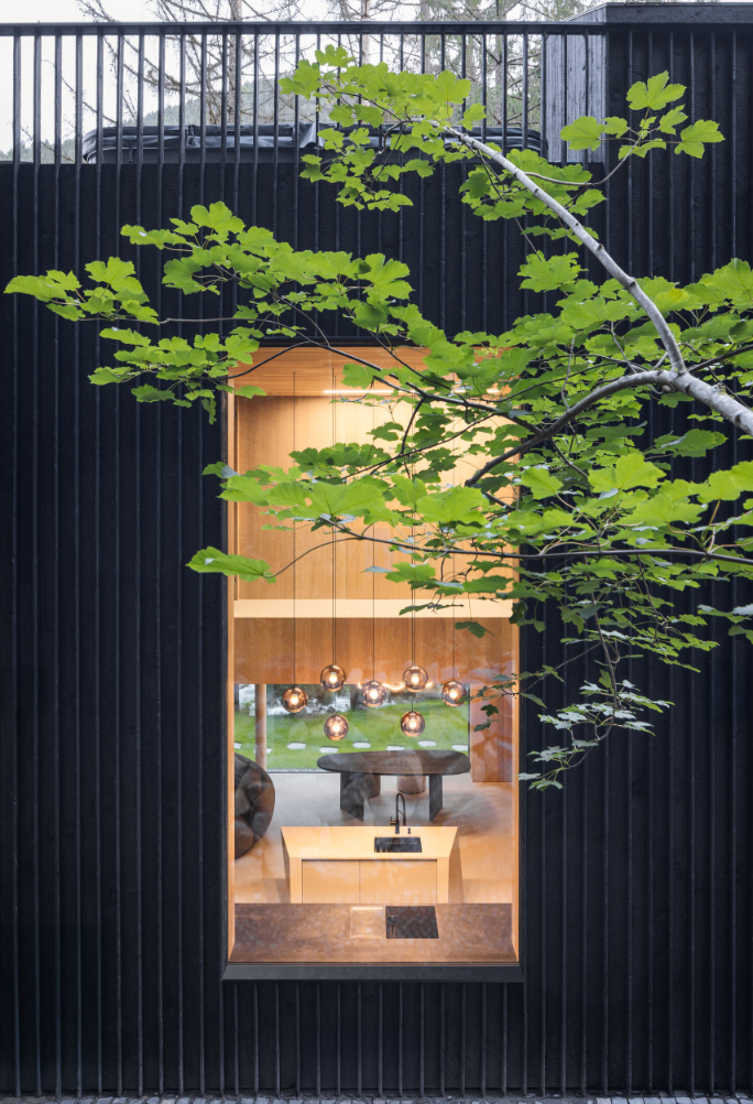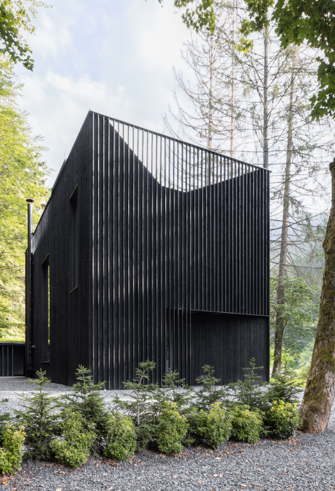 Exteriéru rezidence dominuje dřevěný obklad konzervovaný tradiční japonskou technologií yakisugi. Kontrolované opalování dřeva zvyšuje nejen odolnost materiálu vůči povětrnostním i biologickým vlivům, ale i jeho požární odolnost a objektu svou hlubokou matnou černí propůjčuje nezaměnitelný charakter.