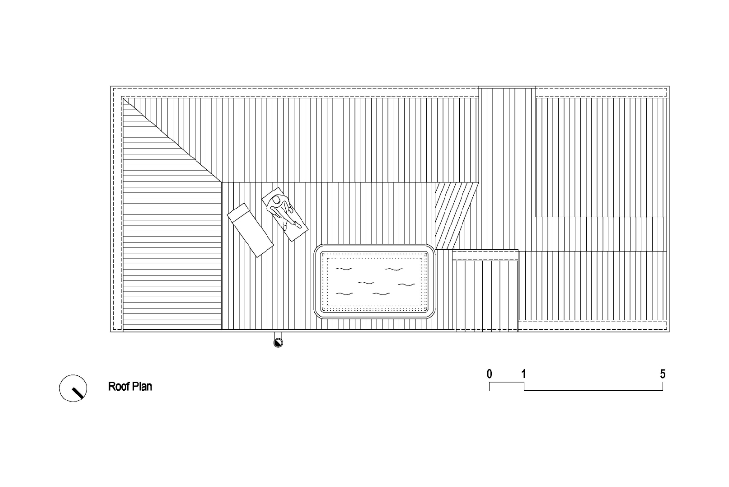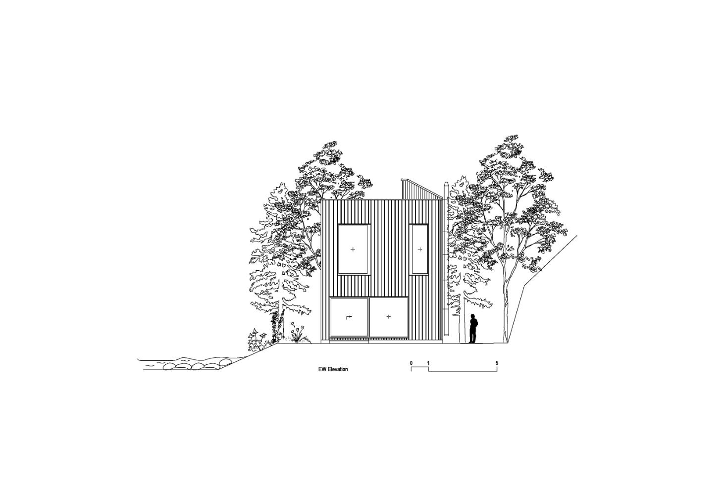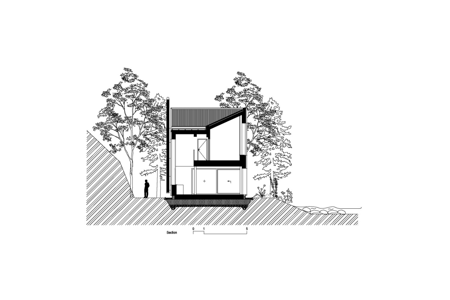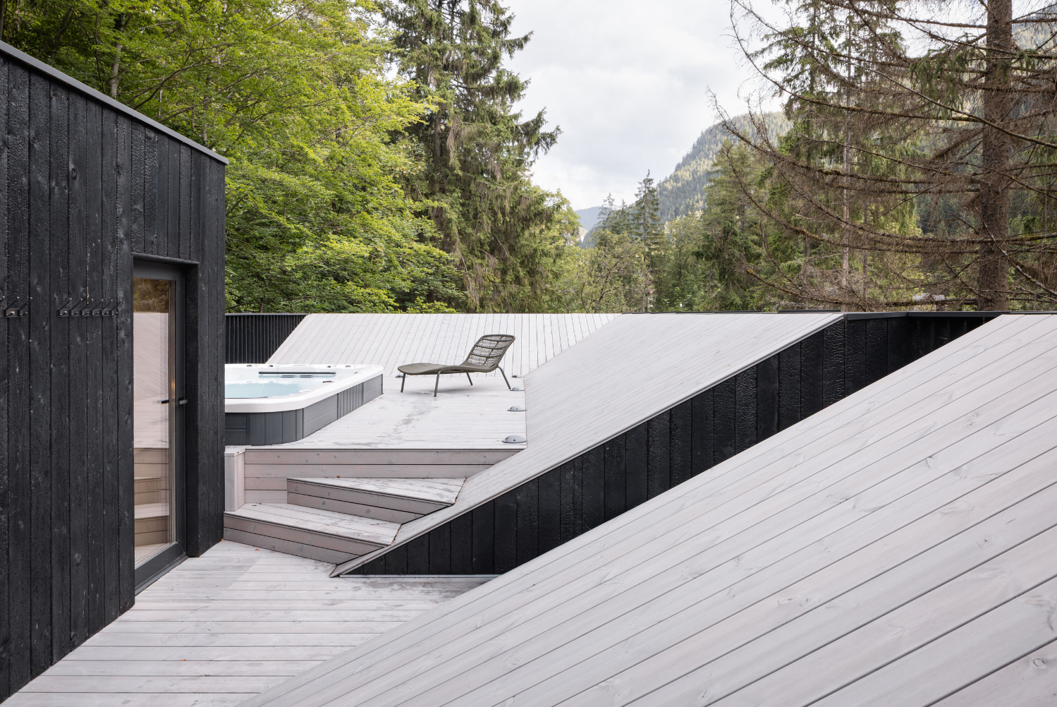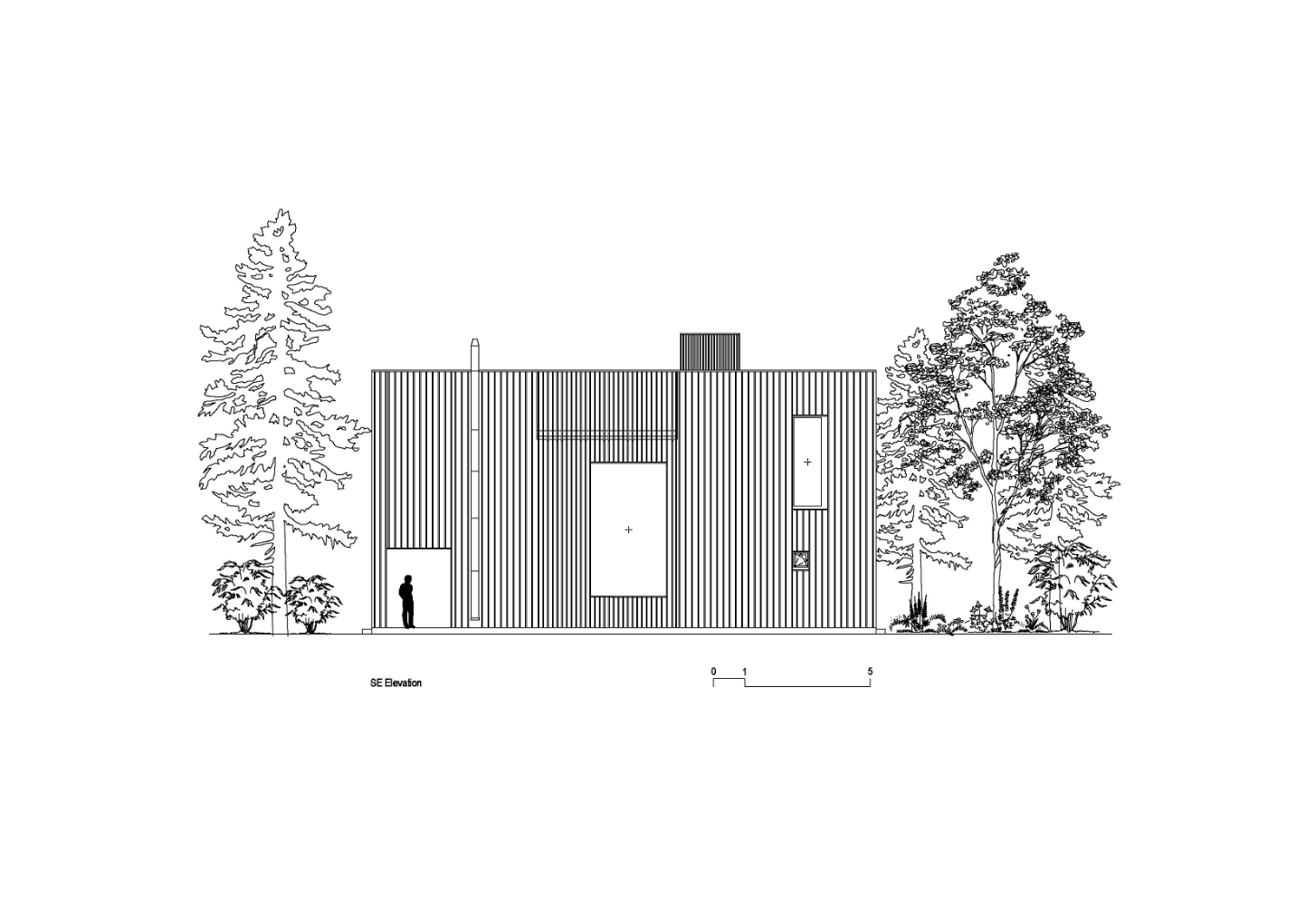 Exteriéru rezidence dominuje dřevěný obklad konzervovaný tradiční japonskou technologií yakisugi. Kontrolované opalování dřeva zvyšuje nejen odolnost materiálu vůči povětrnostním i biologickým vlivům, ale i jeho požární odolnost a objektu svou hlubokou matnou černí propůjčuje nezaměnitelný charakter.