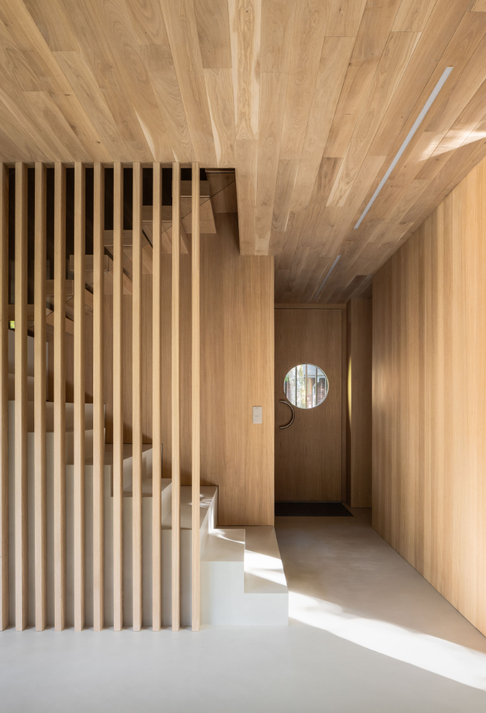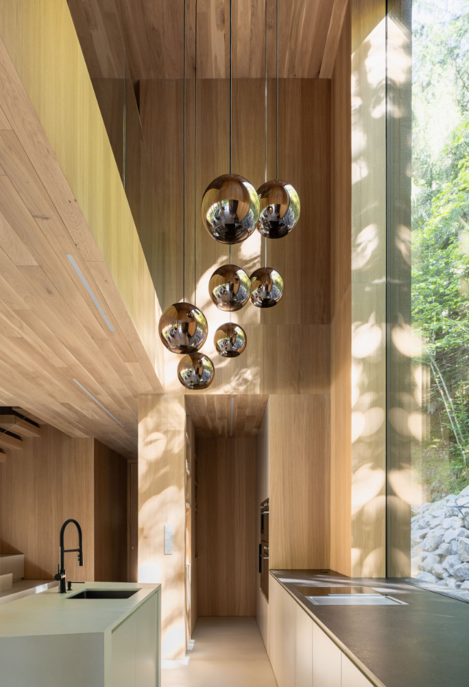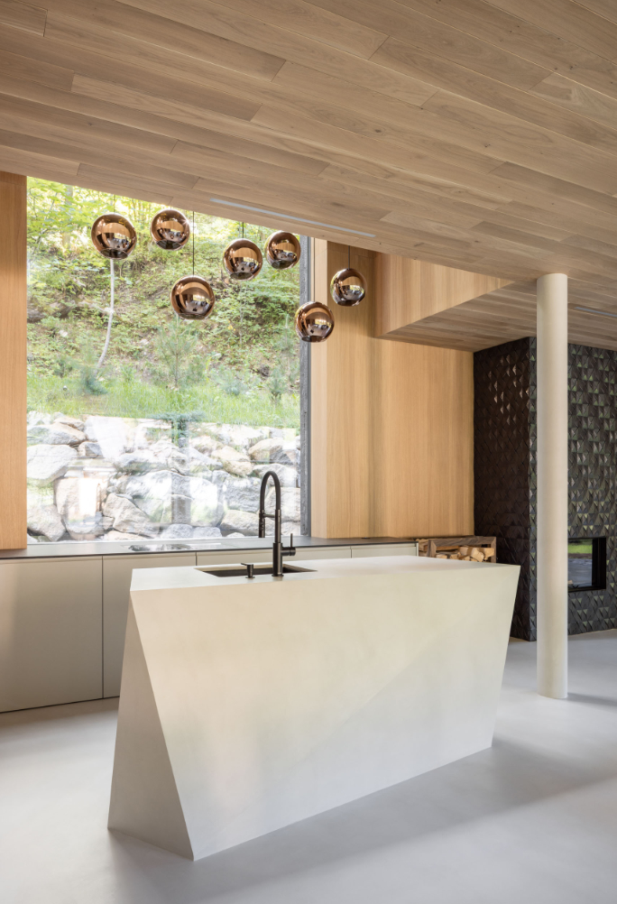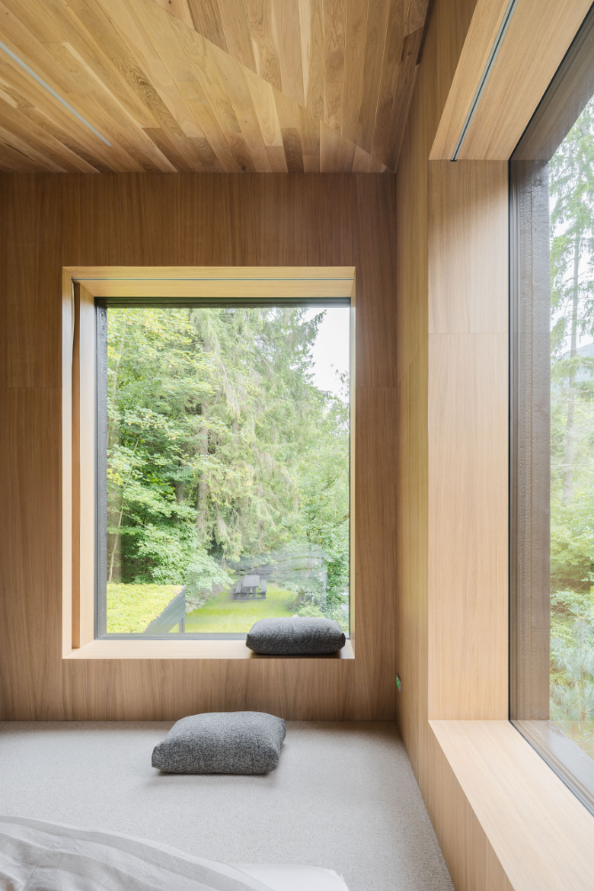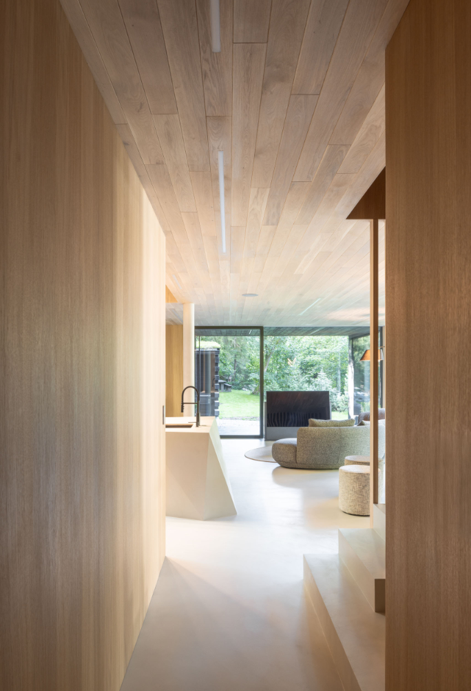Interiér, který si klient s asistencí autora stavby vybavoval sám, se vyznačuje aplikací dřevěné dýhy na stěnách i stropech, jež je sjednocena mikrocementovými podlahami v exponovaných částech (v obytné zóně a v koupelnách).