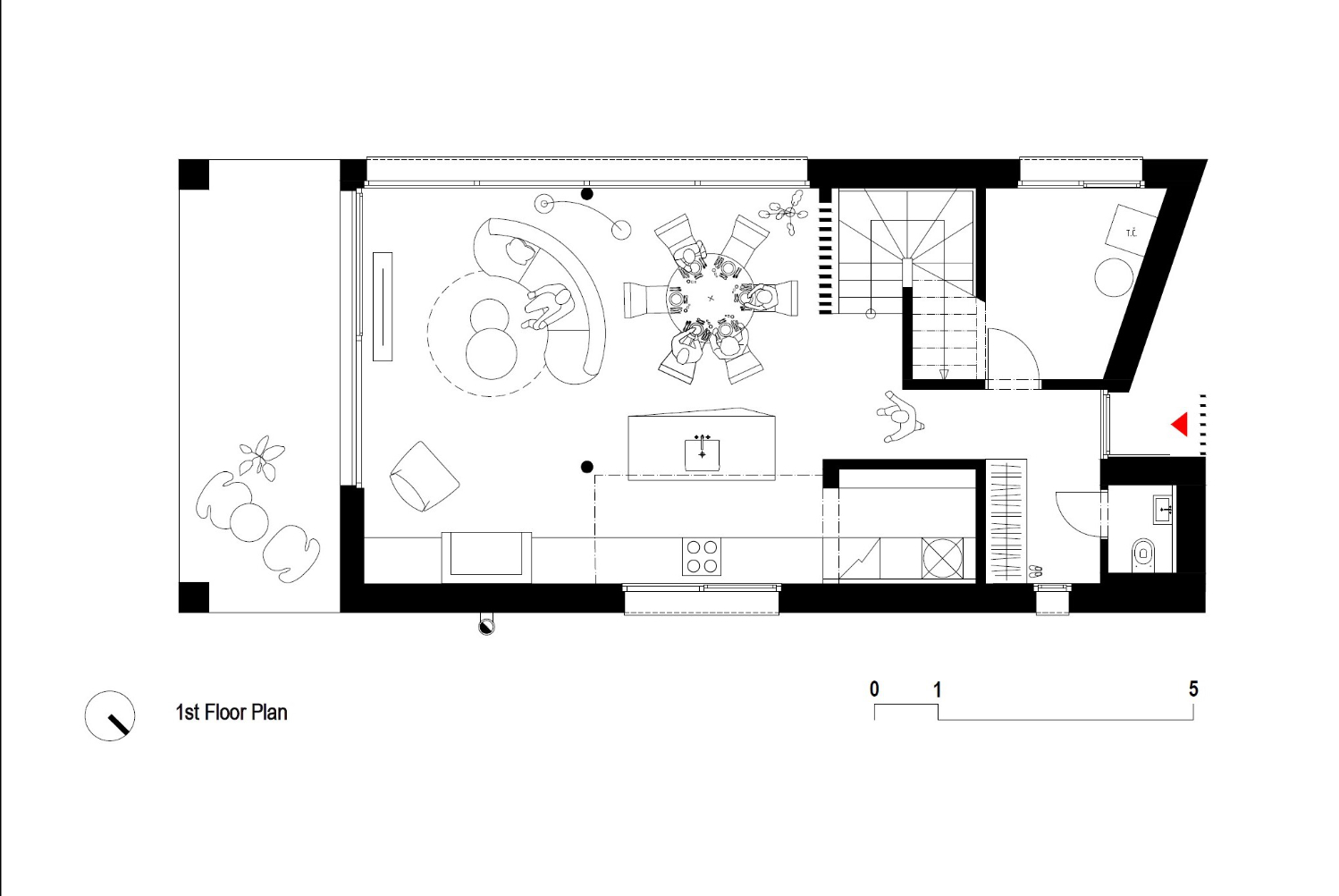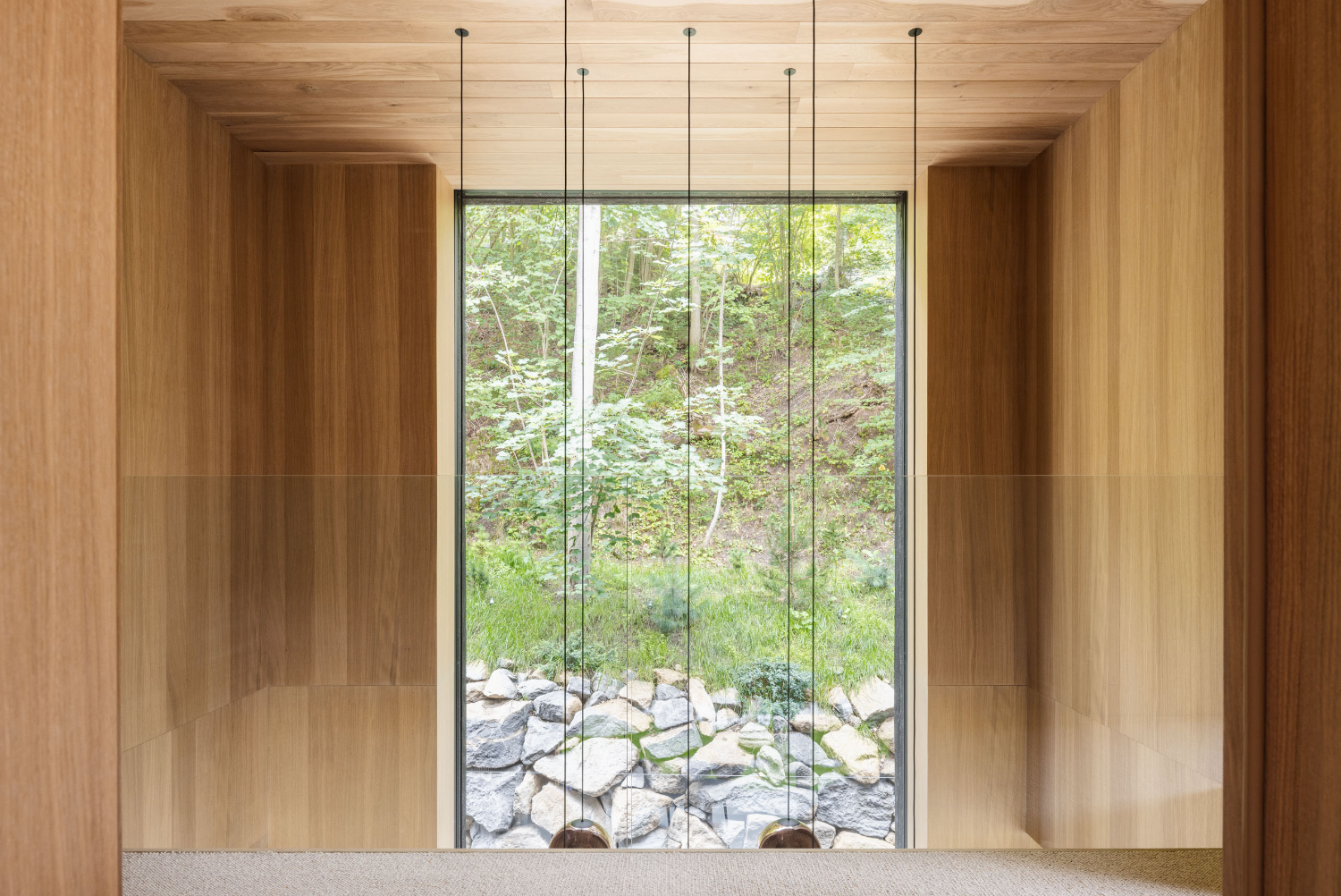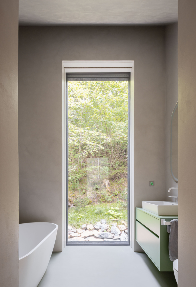 Interiér, který si klient s asistencí autora stavby vybavoval sám, se vyznačuje aplikací dřevěné dýhy na stěnách i stropech, jež je sjednocena mikrocementovými podlahami v exponovaných částech (v obytné zóně a v koupelnách).